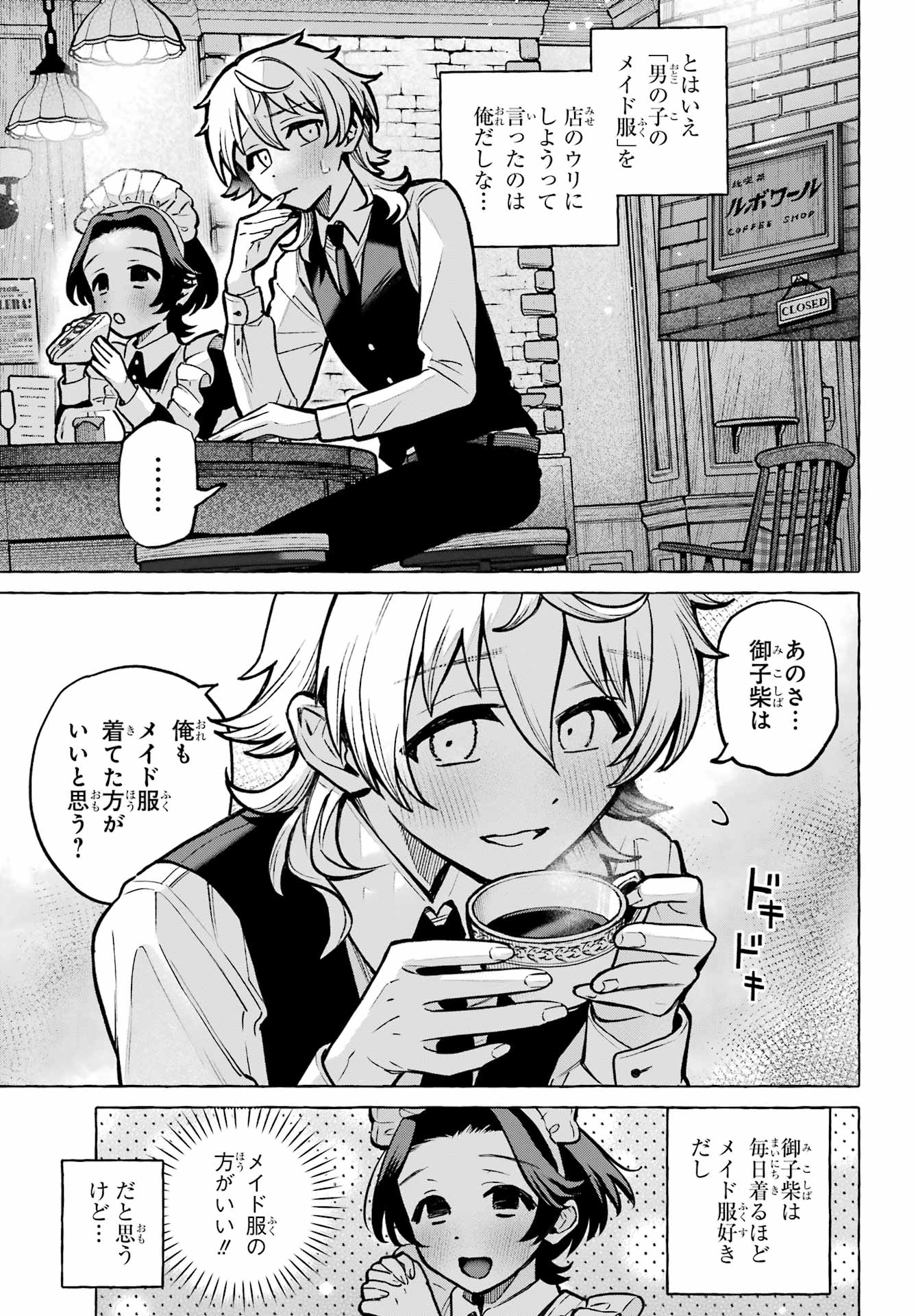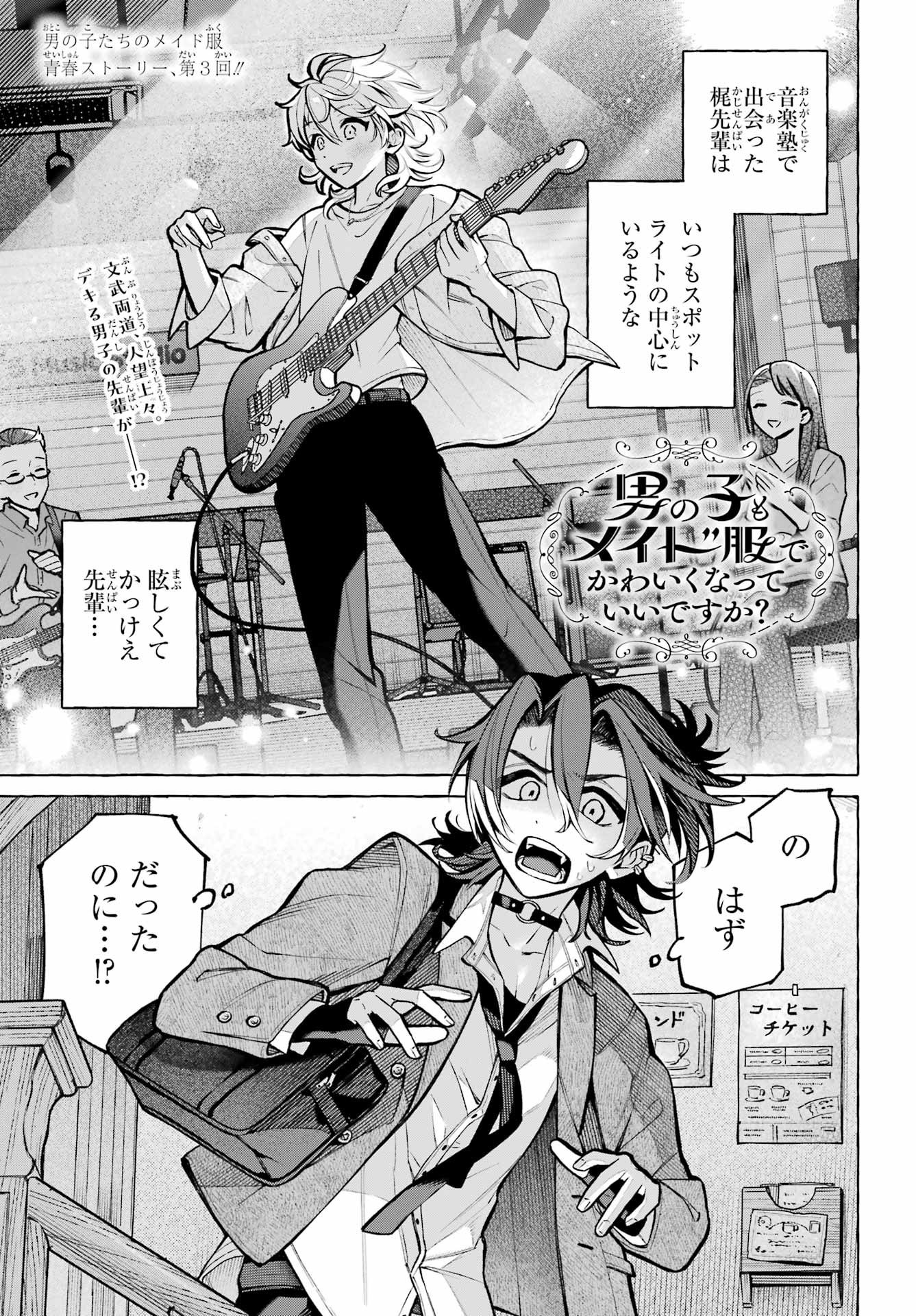 I'll repost chapter 2 with an approximation of a translation. Chapter 1 was the oneshot so it got translated at the time. There's a dump here 287068010 . Or by looking up the topic on your site of choice.>喫茶店でバイトを始めた俺。。。I've started working part time at the tea shop...>男の子がメイド服を着る純喫茶」として 少しはお客さんも増えてきた の。。。だが As "a tea shop where boys wear maid outfits", we've seen an increase in customers, however...>梶くん Kaji-kun.>男子高校生たちのメイド服青春ストーリー第2回!! Chapter 2 of this heartfelt story about high-school boys wearing maid outfits !! >男の子もメイド服でかわいくなっていいですか?Can boys be cute in maid outfits too? / Is it okay for boys to look cute wearing maid outfits?