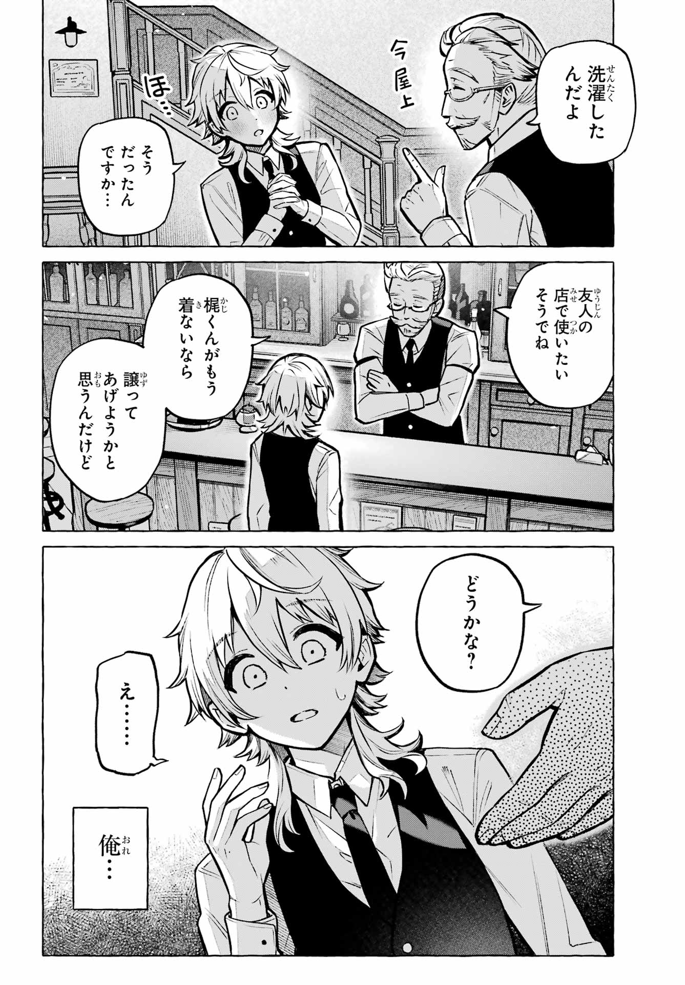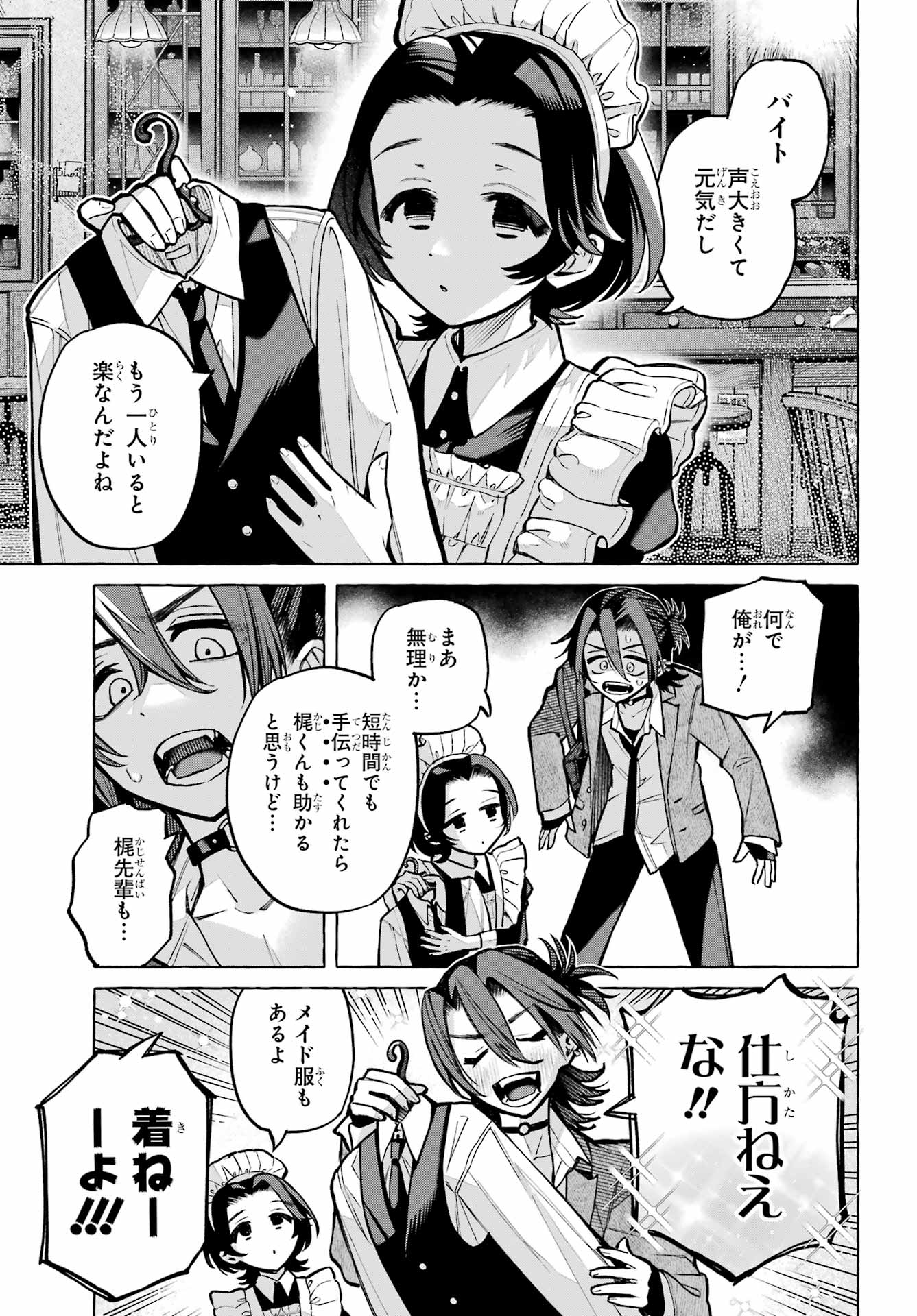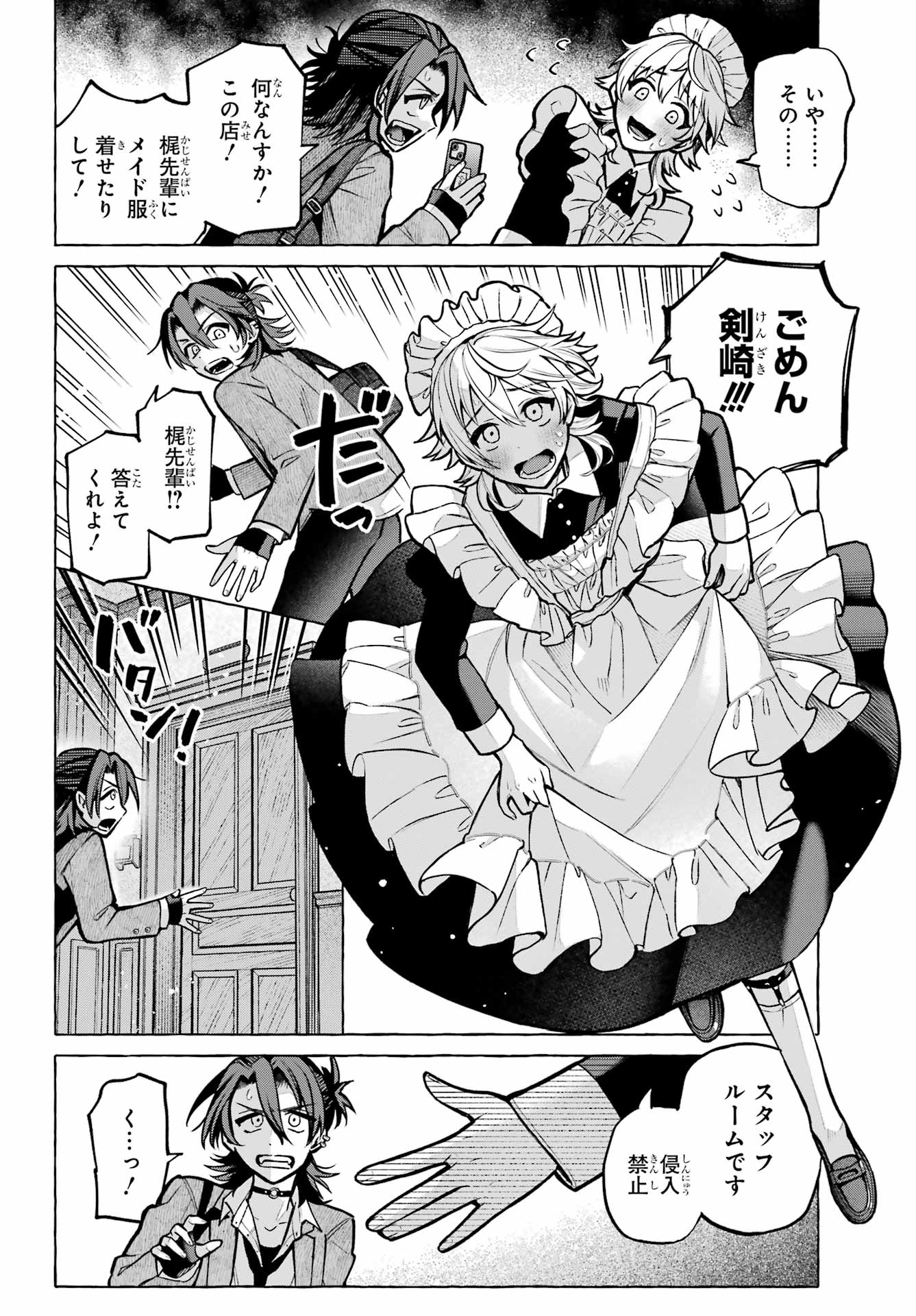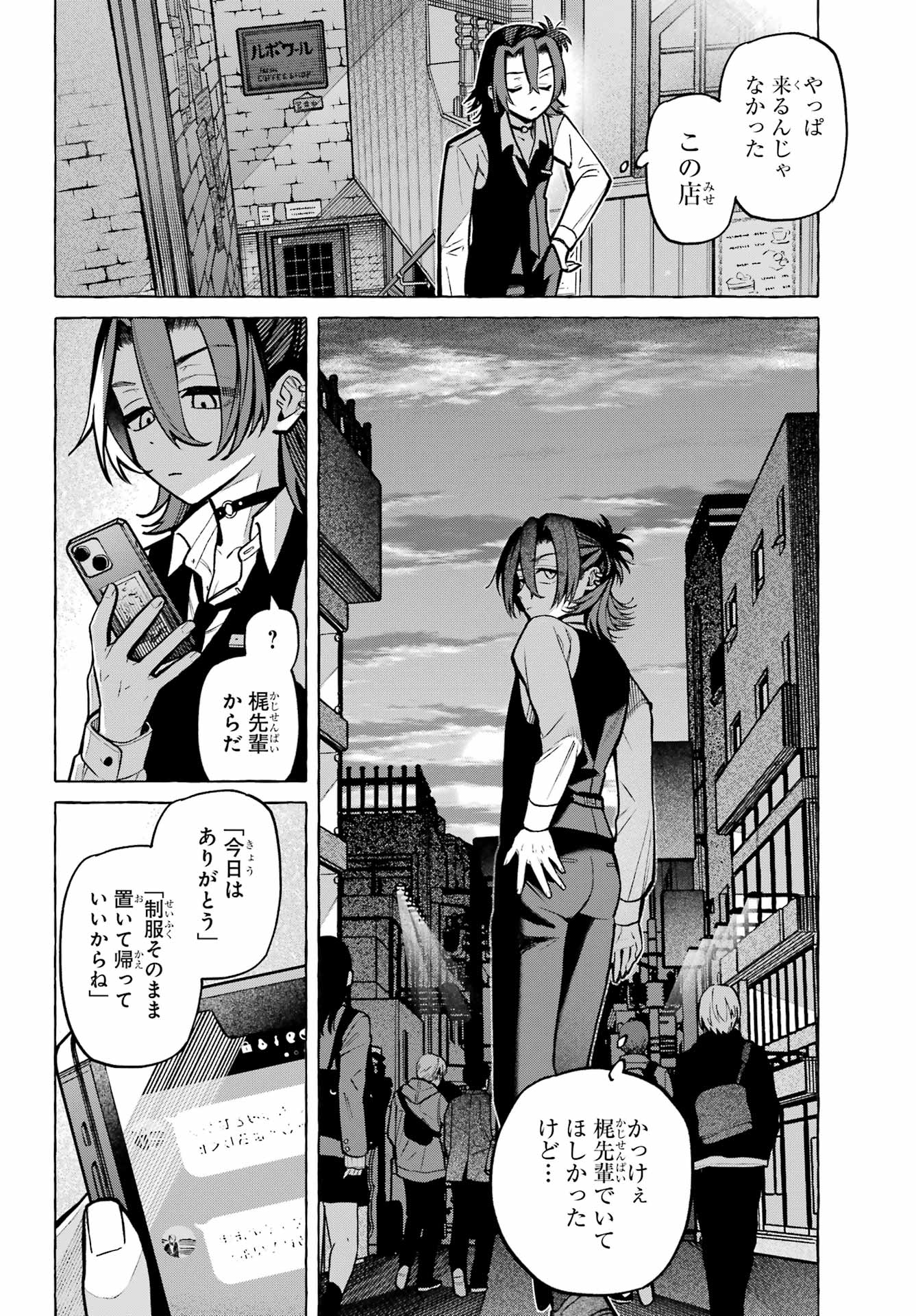 > 梶くんちょっといい?+ Kaji-kun, may I?> 相談が。。。+ Could I ask you something?> 手伝ってほしいことあって。。。+ There's something I'd like your help with...> 無視できない。。。!!+ I can't slip away!> このままじゃ+ At this rate...> 好きにすれば?+ Do as you please?> あの意味が確かめられないかも。。。+ Will I be able to find out what he meant?> もう店のSNSに連絡するしかないか。。。+ I guess I have to reach out using the store's social media...> 御子柴気付くかな?+ Will Mikoshiba notice, I wonder?