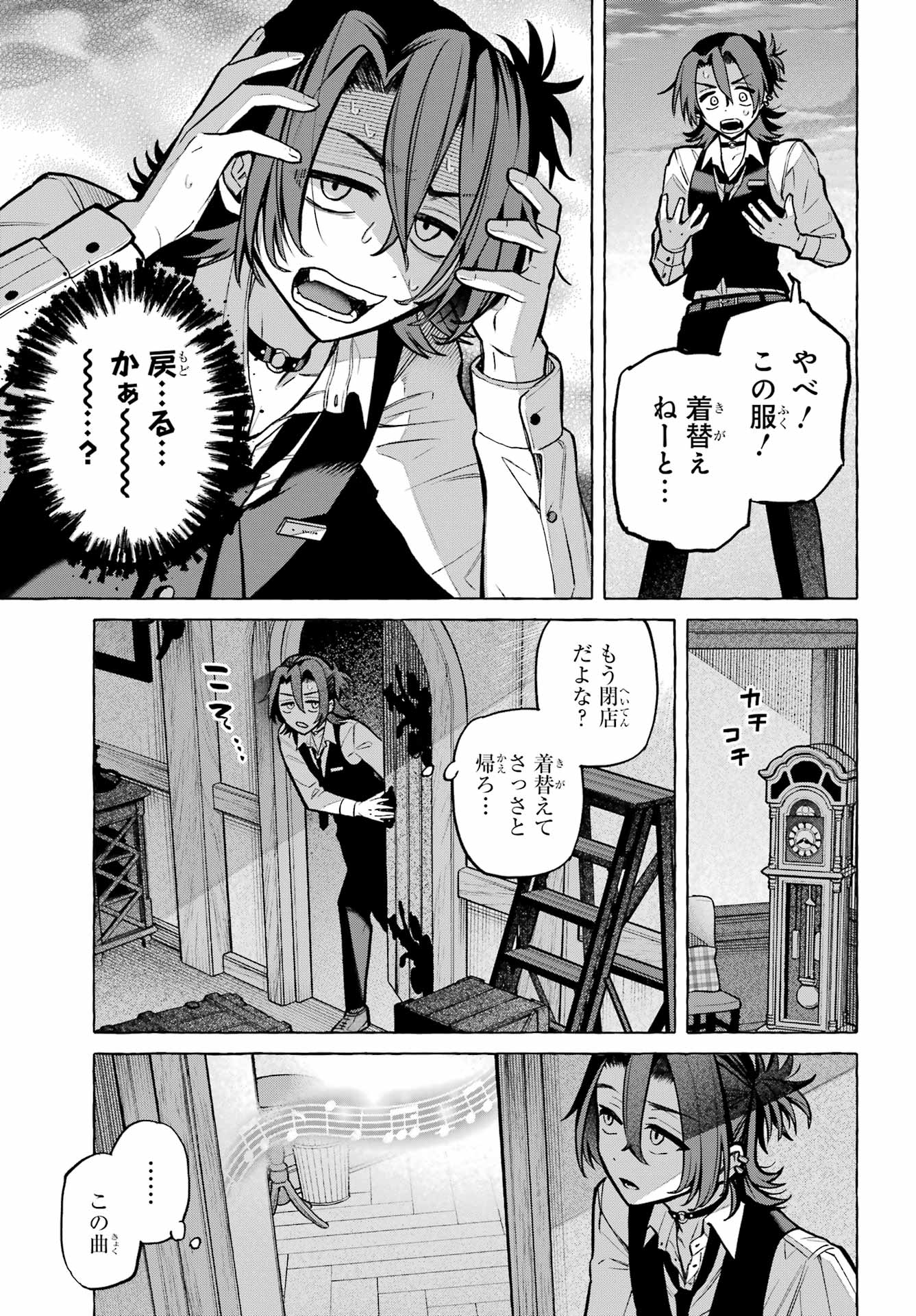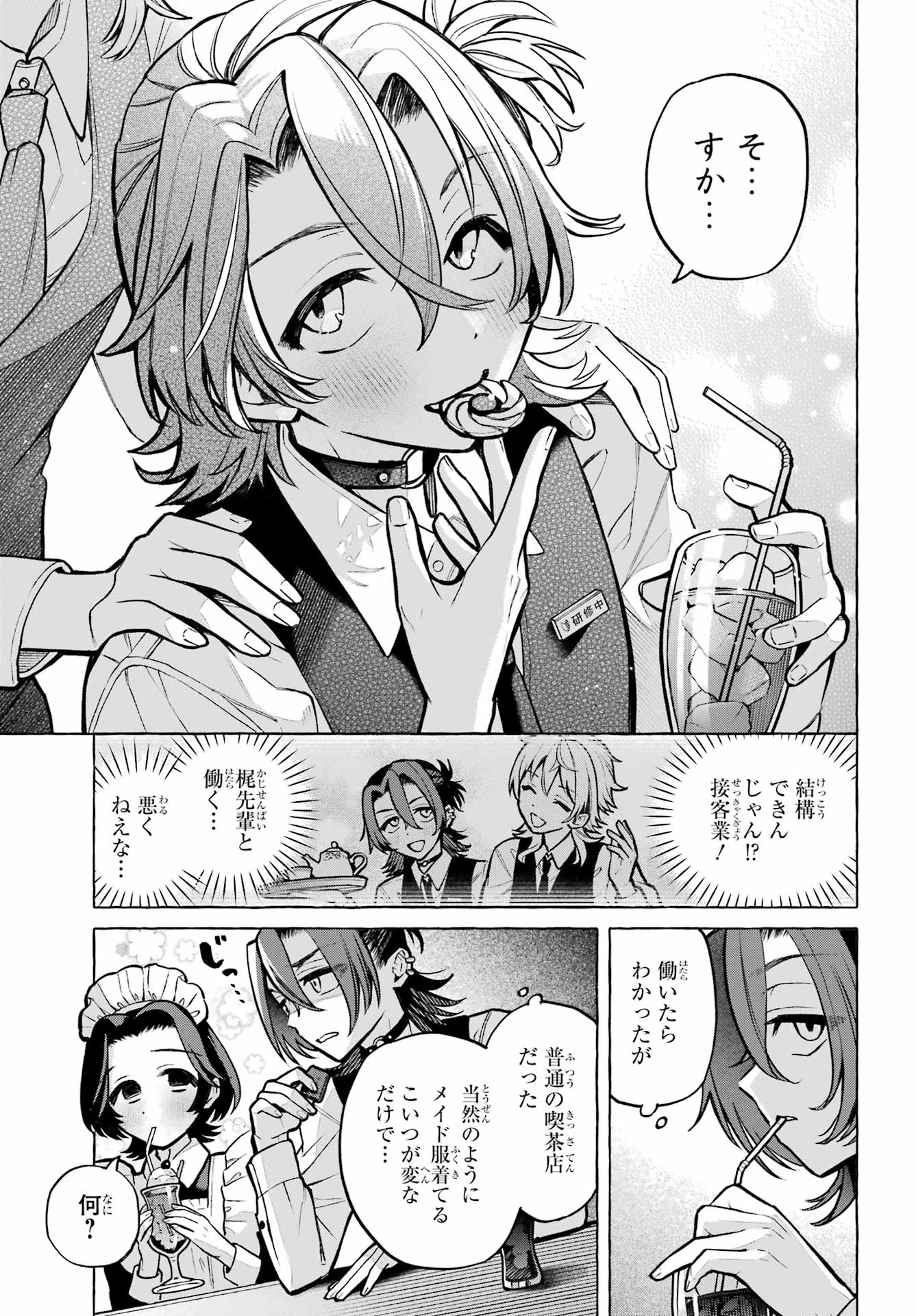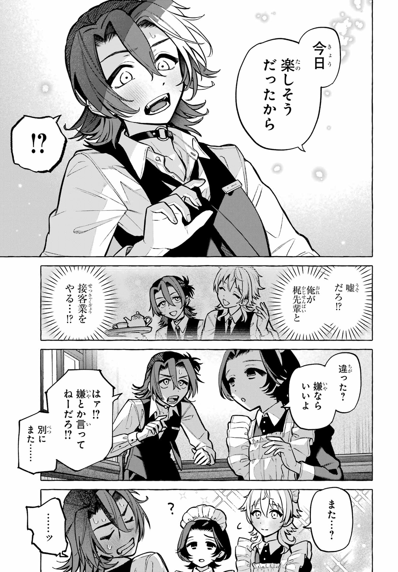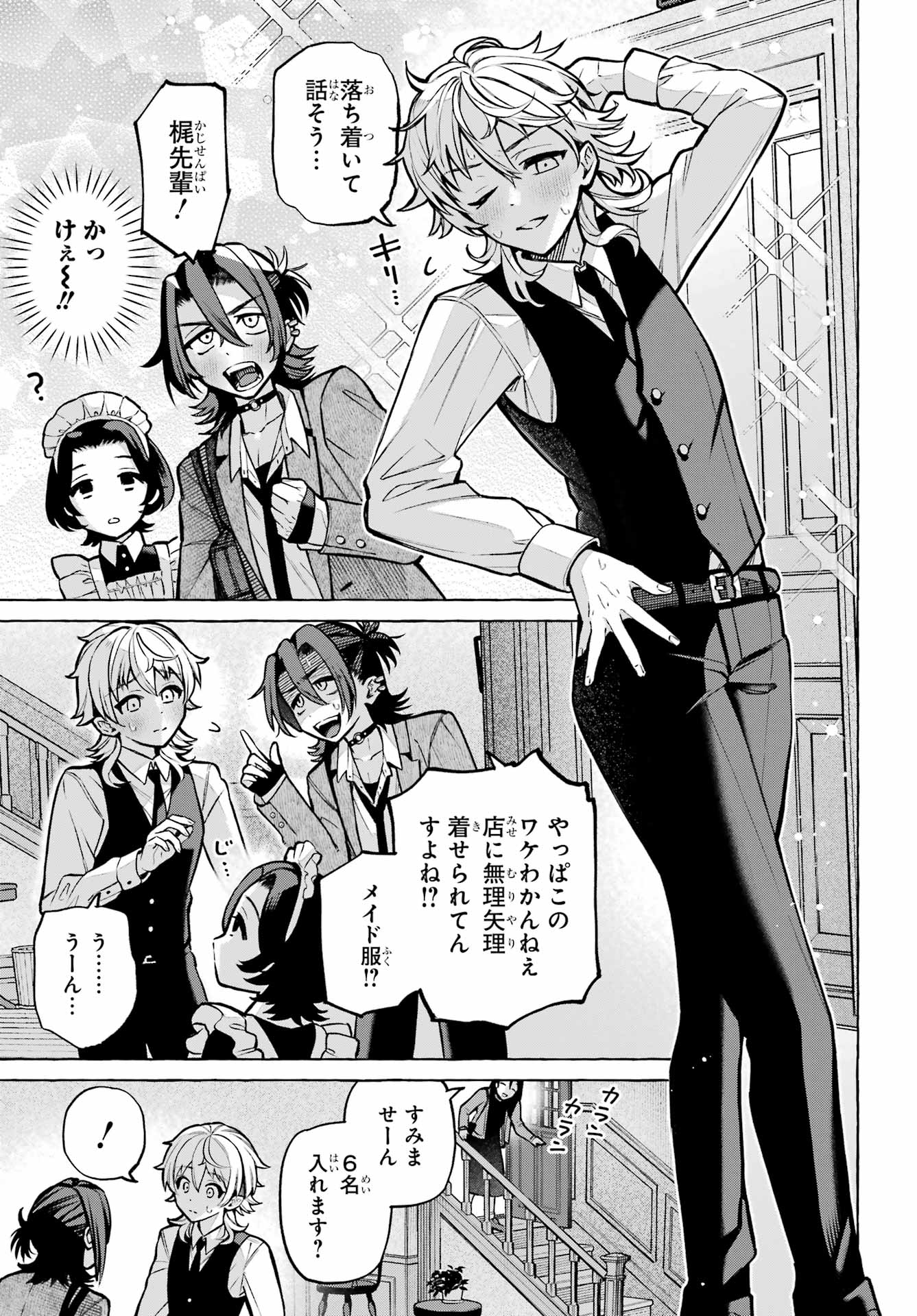 > 梶くんちょっといい?+ Kaji-kun, may I?> 相談が。。。+ Could I ask you something?> 手伝ってほしいことあって。。。+ There's something I'd like your help with...> 無視できない。。。!!+ I can't slip away!> このままじゃ+ At this rate...> 好きにすれば?+ Do as you please?> あの意味が確かめられないかも。。。+ Will I be able to find out what he meant?> もう店のSNSに連絡するしかないか。。。+ I guess I have to reach out using the store's social media...> 御子柴気付くかな?+ Will Mikoshiba notice, I wonder?