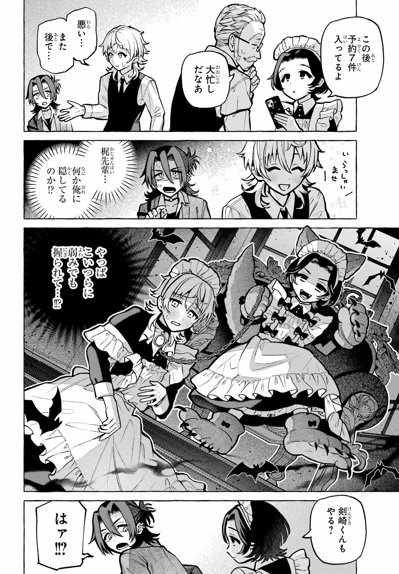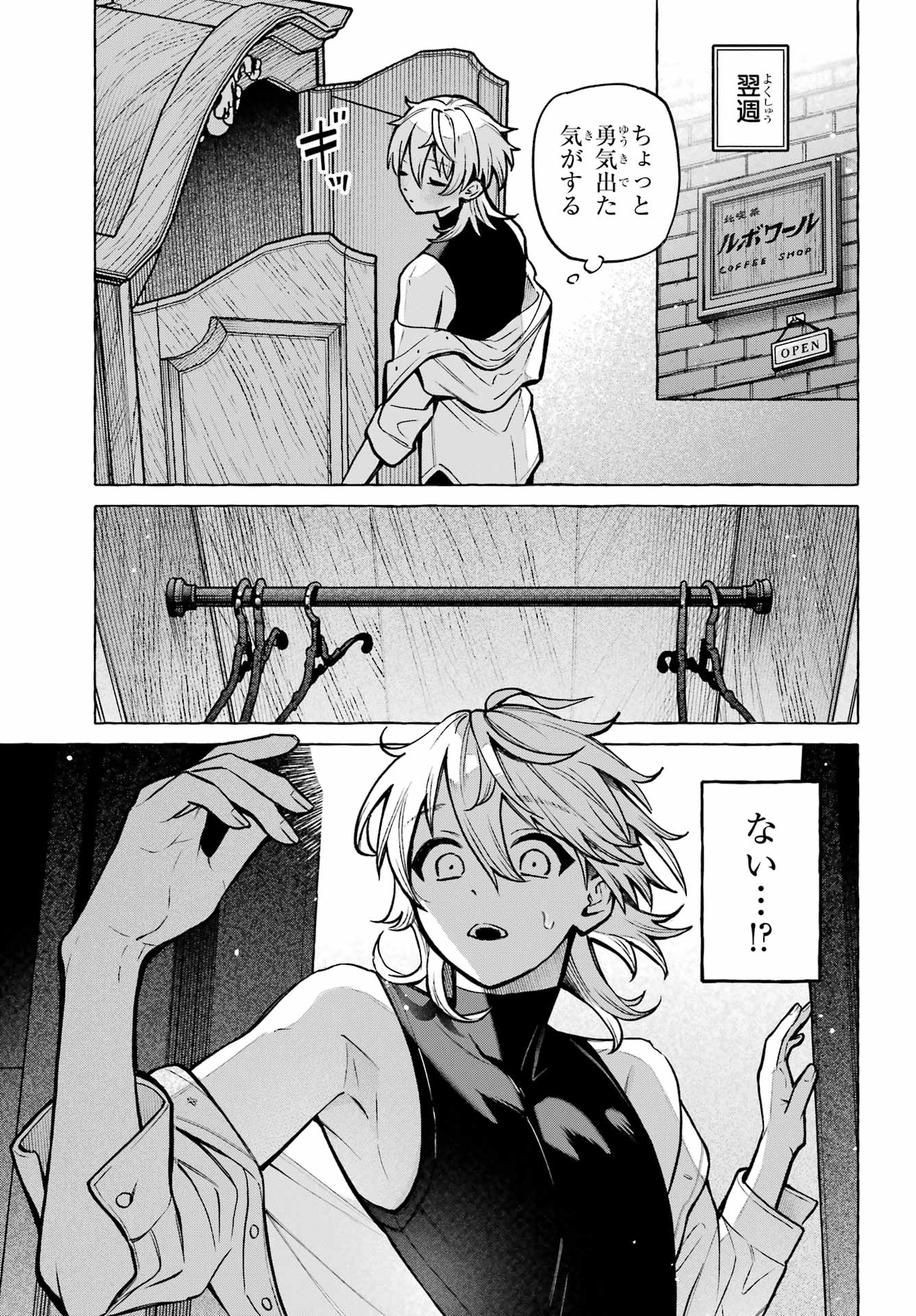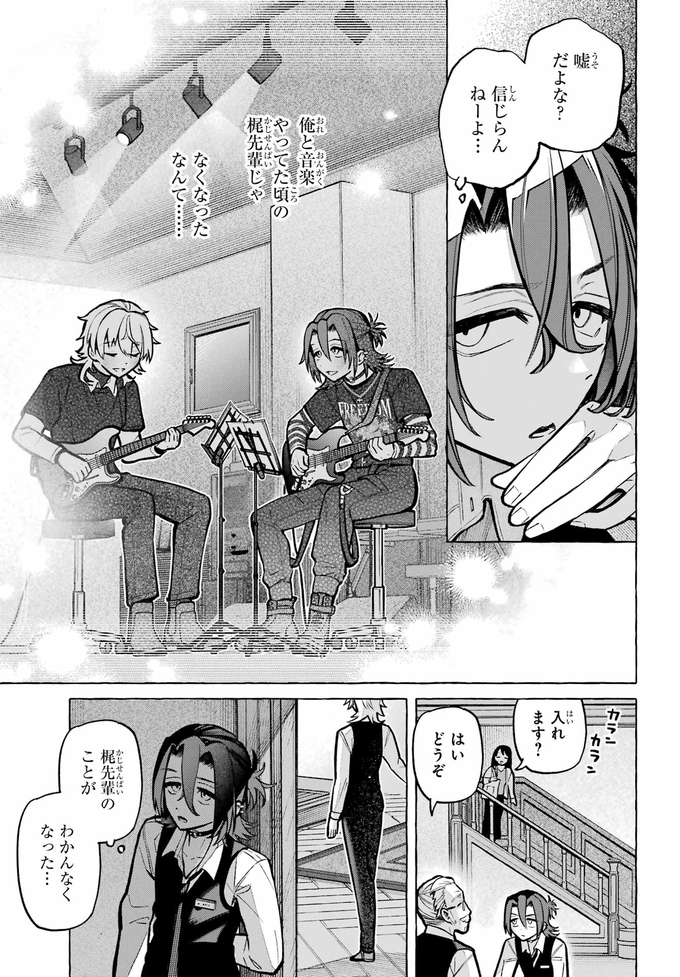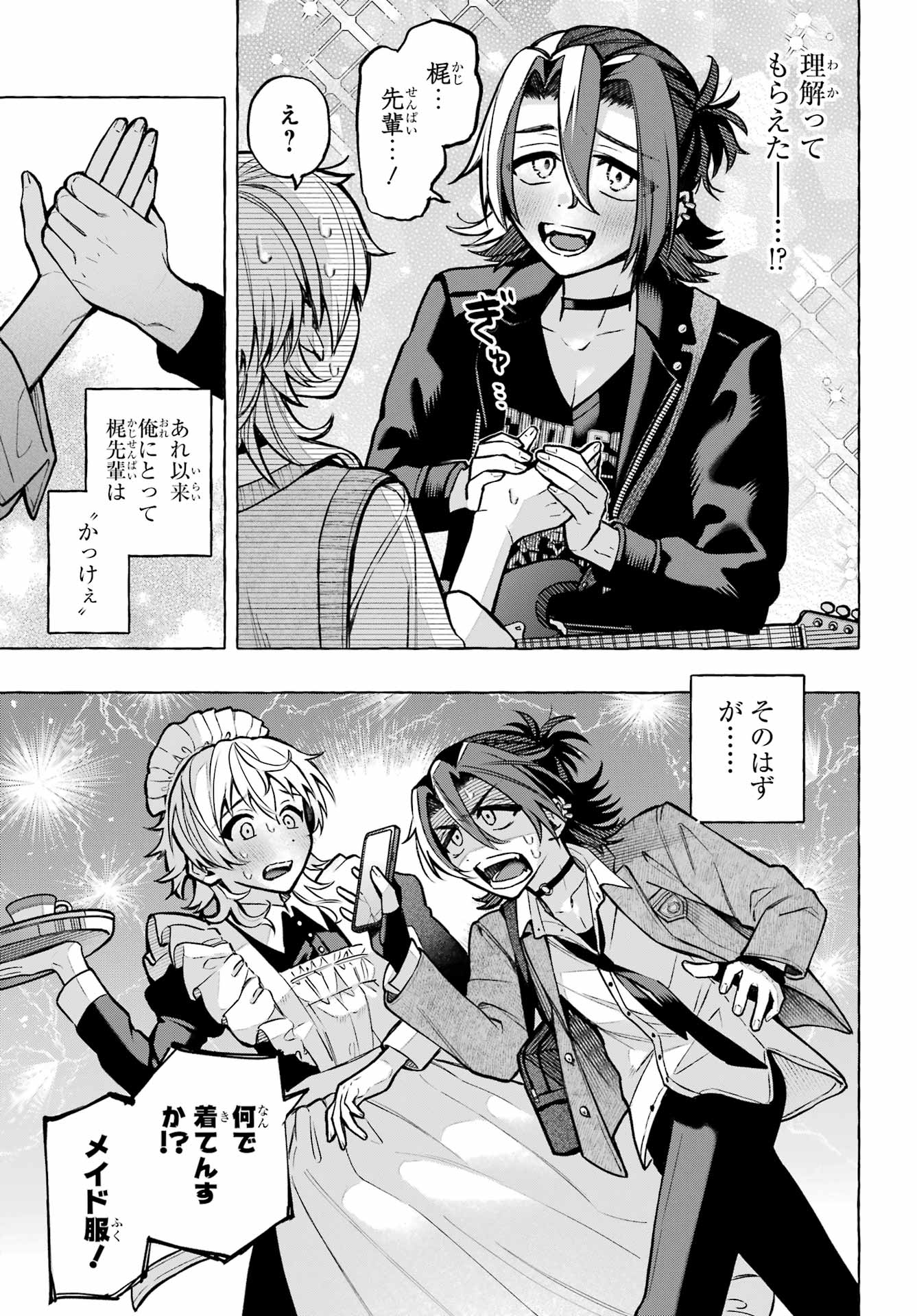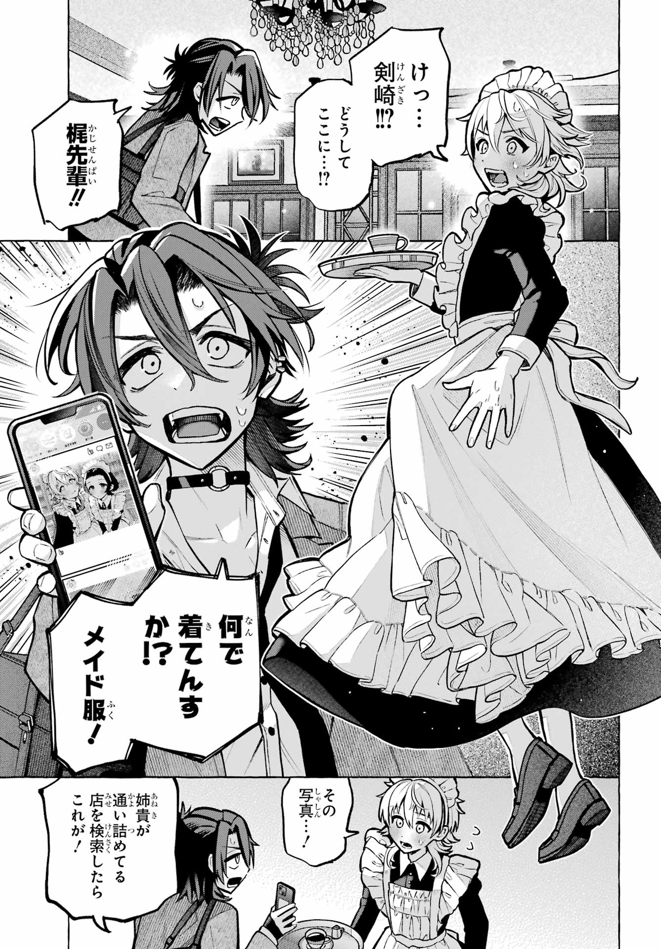 > 梶くんちょっといい?+ Kaji-kun, may I?> 相談が。。。+ Could I ask you something?> 手伝ってほしいことあって。。。+ There's something I'd like your help with...> 無視できない。。。!!+ I can't slip away!> このままじゃ+ At this rate...> 好きにすれば?+ Do as you please?> あの意味が確かめられないかも。。。+ Will I be able to find out what he meant?> もう店のSNSに連絡するしかないか。。。+ I guess I have to reach out using the store's social media...> 御子柴気付くかな?+ Will Mikoshiba notice, I wonder?