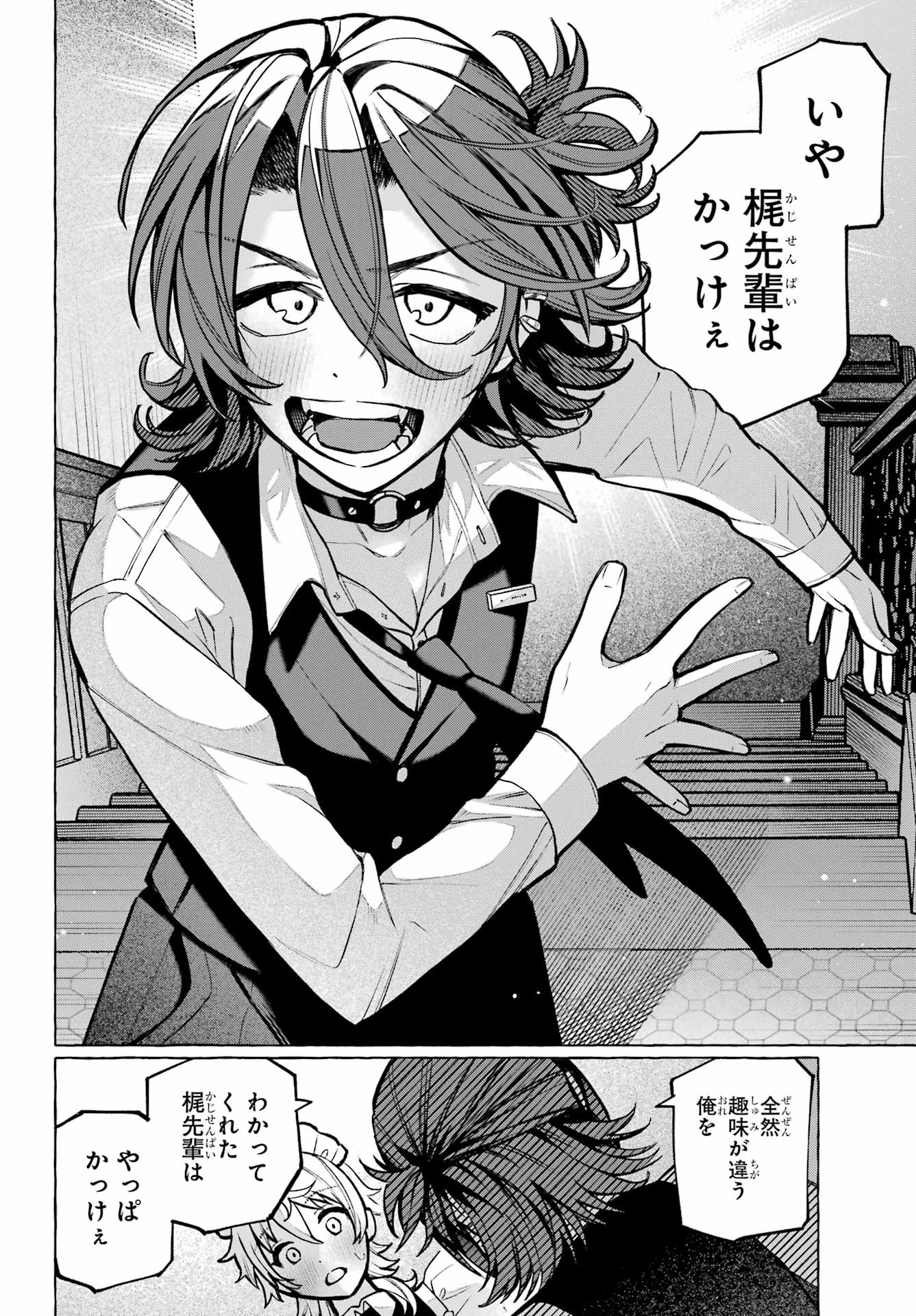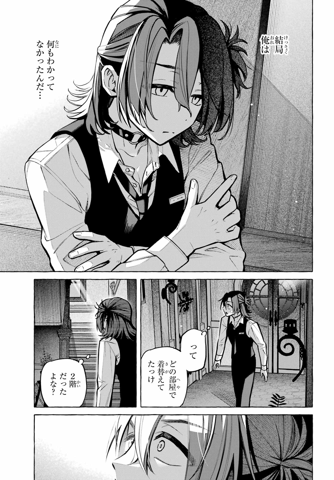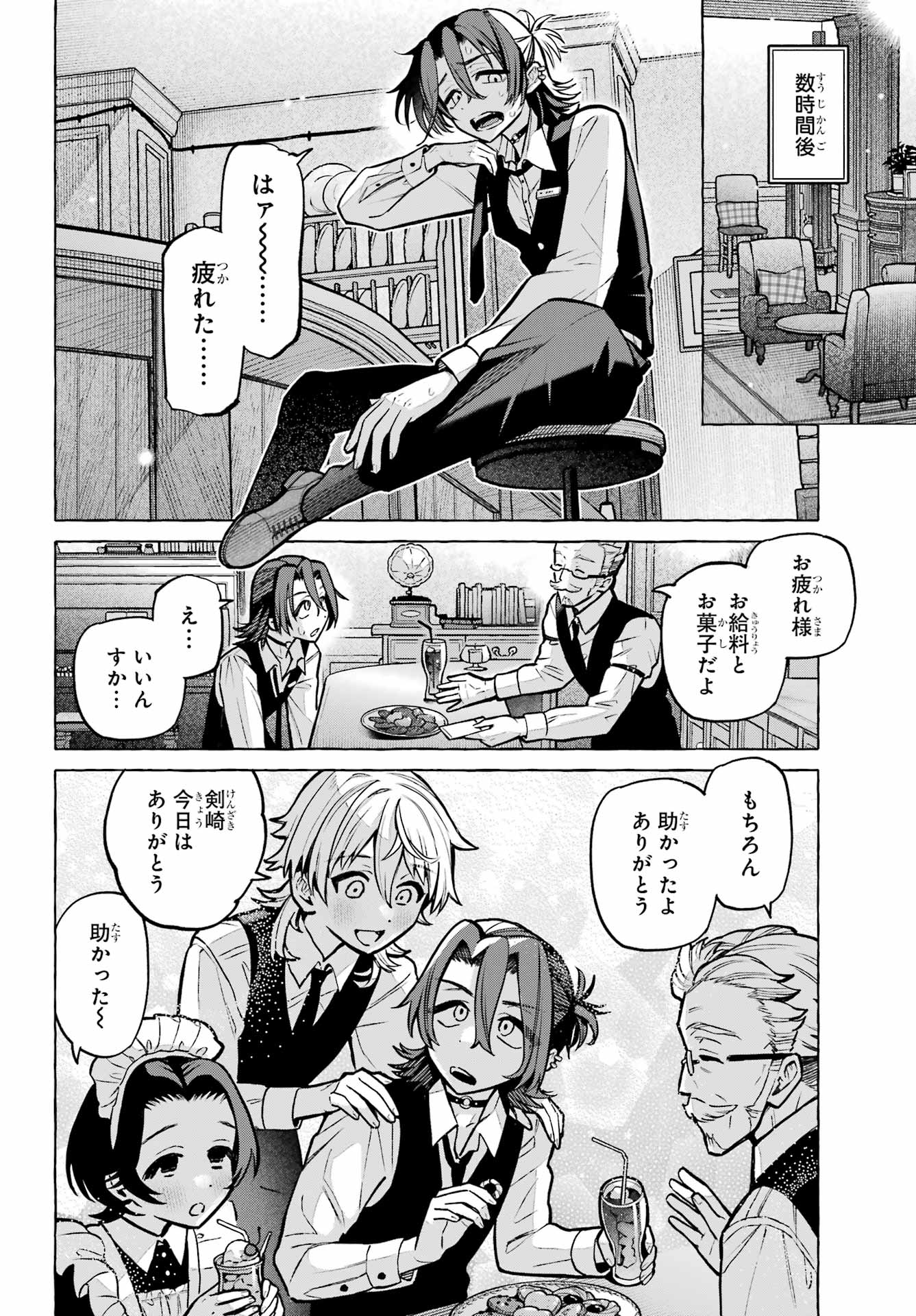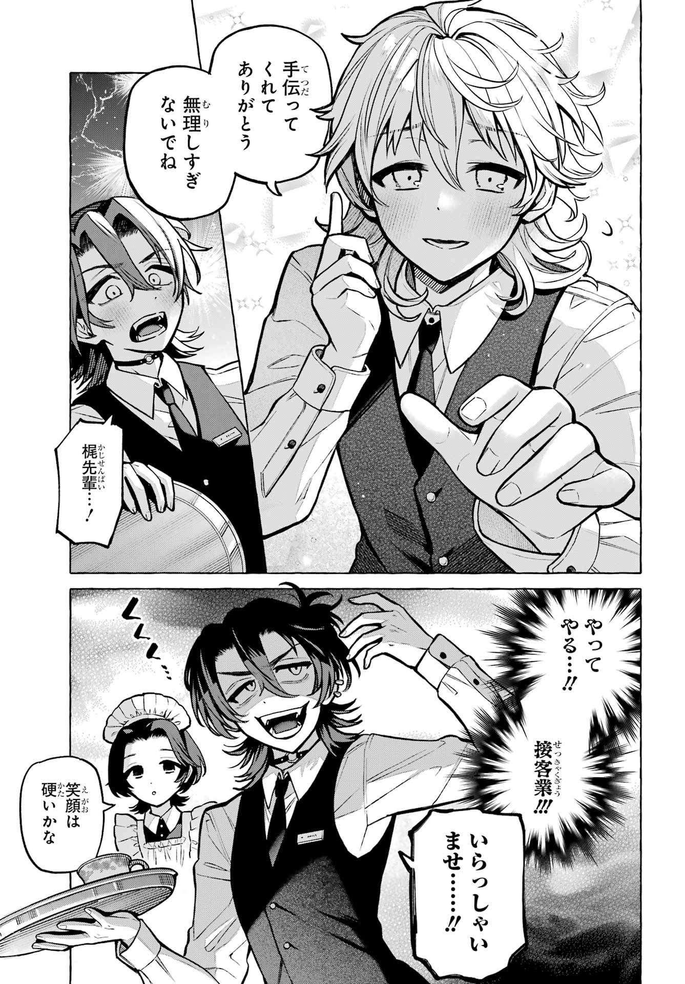 > 梶くんちょっといい?+ Kaji-kun, may I?> 相談が。。。+ Could I ask you something?> 手伝ってほしいことあって。。。+ There's something I'd like your help with...> 無視できない。。。!!+ I can't slip away!> このままじゃ+ At this rate...> 好きにすれば?+ Do as you please?> あの意味が確かめられないかも。。。+ Will I be able to find out what he meant?> もう店のSNSに連絡するしかないか。。。+ I guess I have to reach out using the store's social media...> 御子柴気付くかな?+ Will Mikoshiba notice, I wonder?