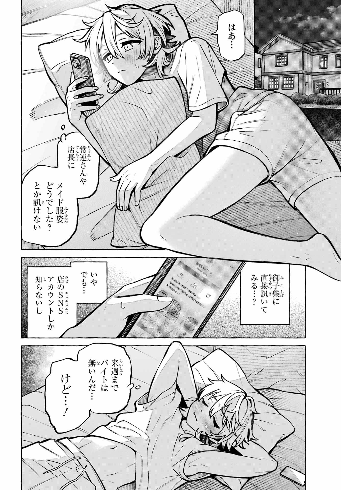 > はあ。。。+ Sigh...> 常連さんや店長にメイド服どうでした?とか訊けない+ I can't really ask the regulars and owner, "How was I in the Maid outfit?", can I?> 御子柴に直接訊いてみる?+ Should I try directly asking Mikoshiba?> いやでも。。。店のSNSアカウントしか知らないし+ Ah, but... I don't have his contact, only the shop's social media account.> 来週までバイトは無いんだ。。。けど。。。!+ There's no part time until next week... however!