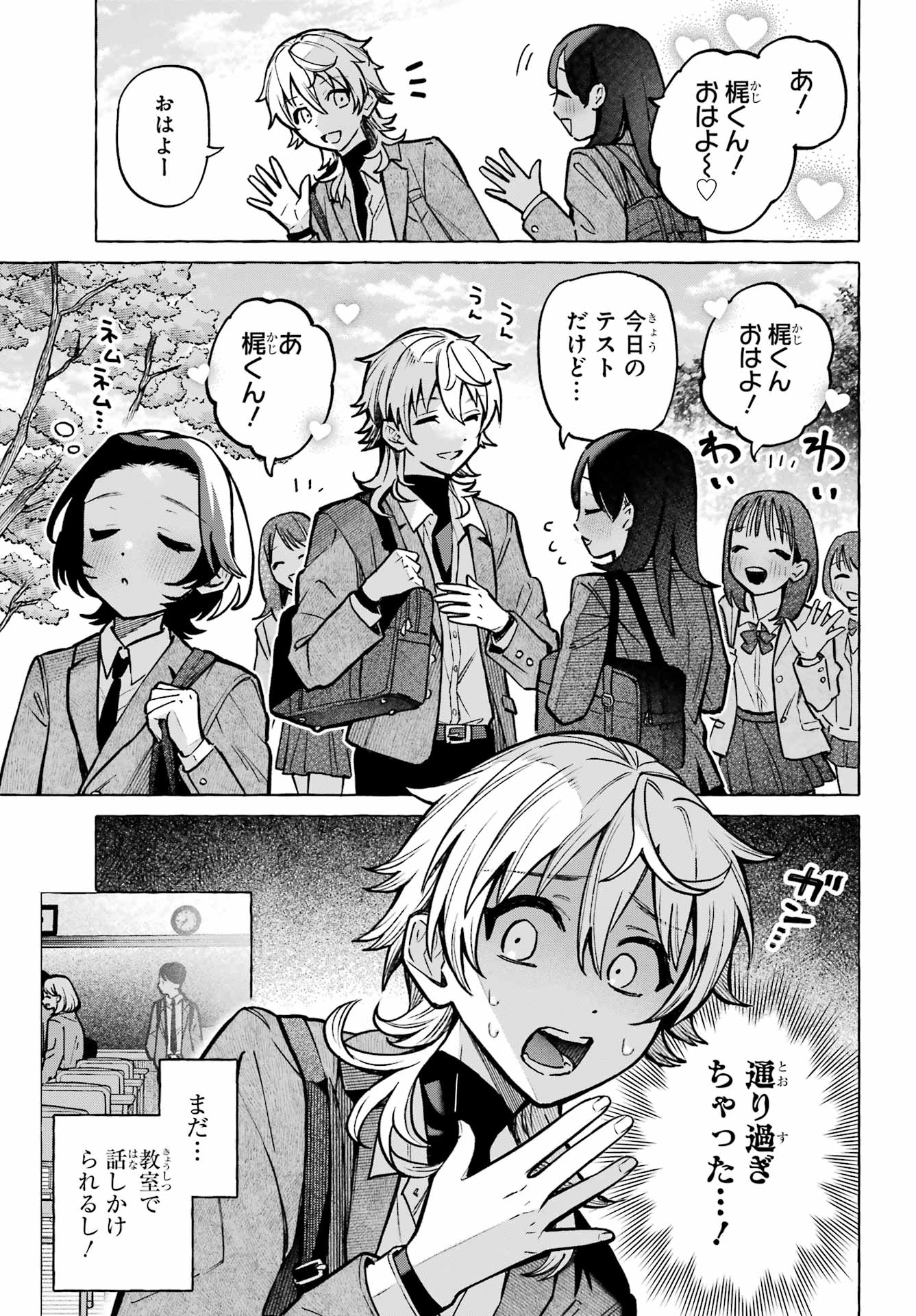 > あ! 梶くんおはよう!+ Ah! Good morning, Kaji-kun!> おはよ~!+ Good morning!> 梶くんおはよ~+ Kaji-kun, good morning~> 今日のテストだけど。。。+ It's just for today's test, but...> あ梶くん!+ Kaji-kun!> 通り過ぎちゃった。。。!+ I missed my chance...!> まだ。。。+ However...> 教室で話しかけられるし!+ I can still approach him in class!