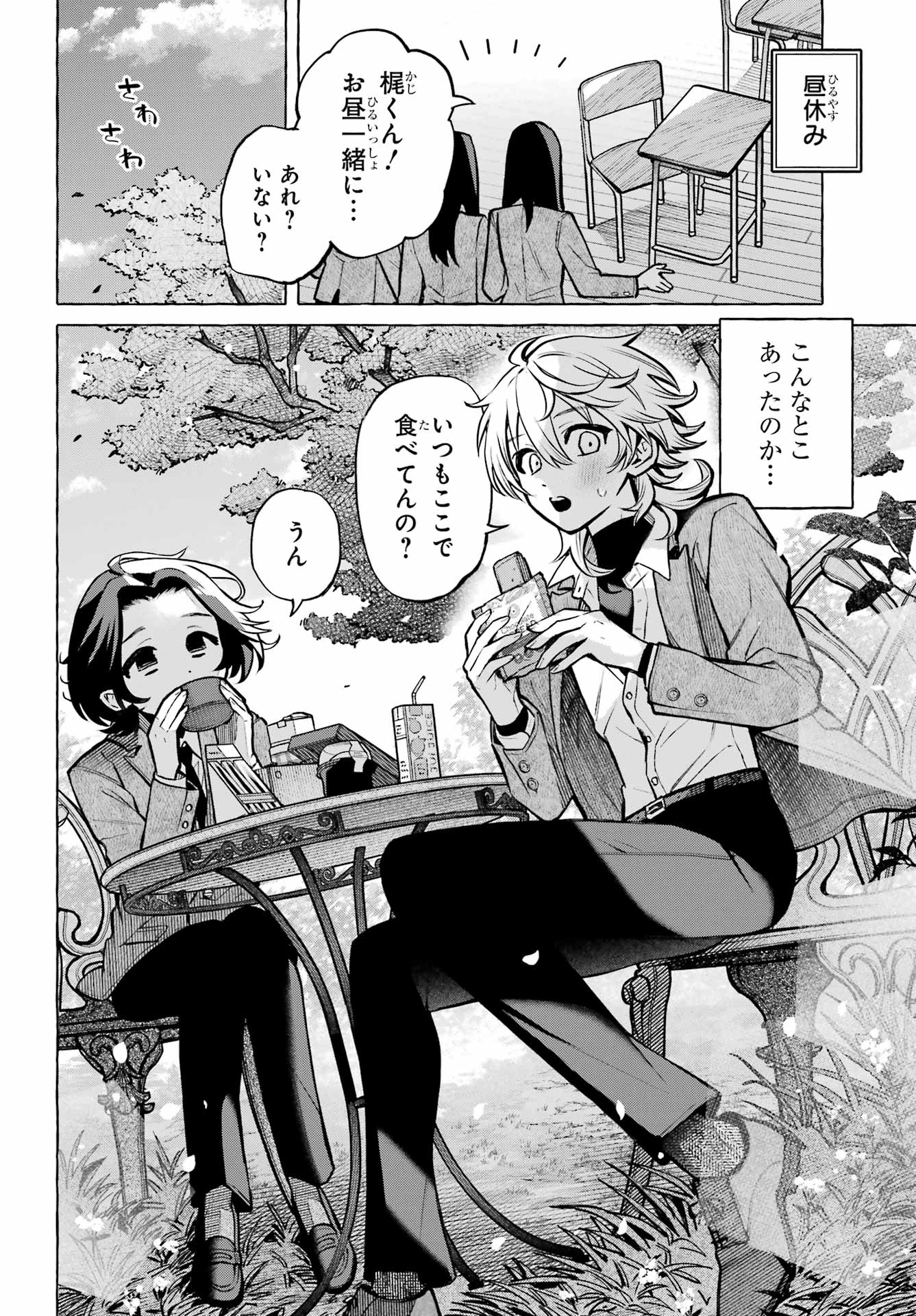 > 昼休み+ Lunch break> 梶くんお昼一緒に。。。あれ? いない?+ Kaki-jun, let's go... Uh? He isn't there?> こんなことあったのか。。。+ In this case...> いつもここで食べてんの?+ Do you always eat here?> うん。+ Yes.