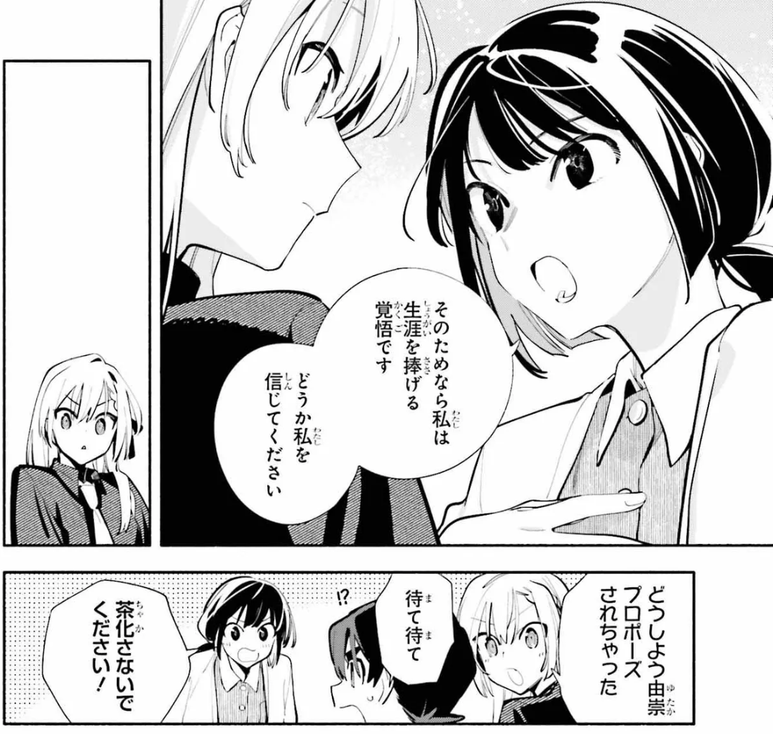 NTA but I do think it's a fair point, most yuri works are just straightforward romances where the characters are laser focused on how they feel and we get very little introspection about how they feel about being homosexual, though I am not trying to argue yuri works need to this at all, it's obviously a conscious choice from the author, she has so many pages to write after all, that said it's definitely weird YH had a whole manga on the taisho era and there was zero thought about this. Amayo is a weird case where all introspection is purely a result from paranoia, Saki never got any hostility from her schoolmates or even her mother, hell even in this chapter everyone seemed to be even cheering for her, while on Kanon's side her sister and best friend all support a relationship with Saki.