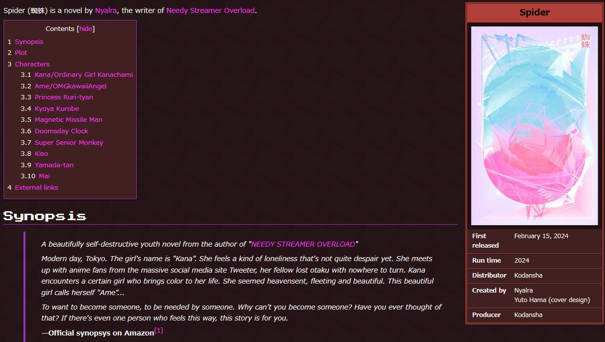 >>287706328>The motif of treating the spider as Ame and the butterfly as KAngel was something that expanded after the game’s release, but I’m very fond of it because spiders are creatures that prey on butterflies caught in their webs.https://hazedenki.net/api/Post/Details/needy-anime-3internet-overdose