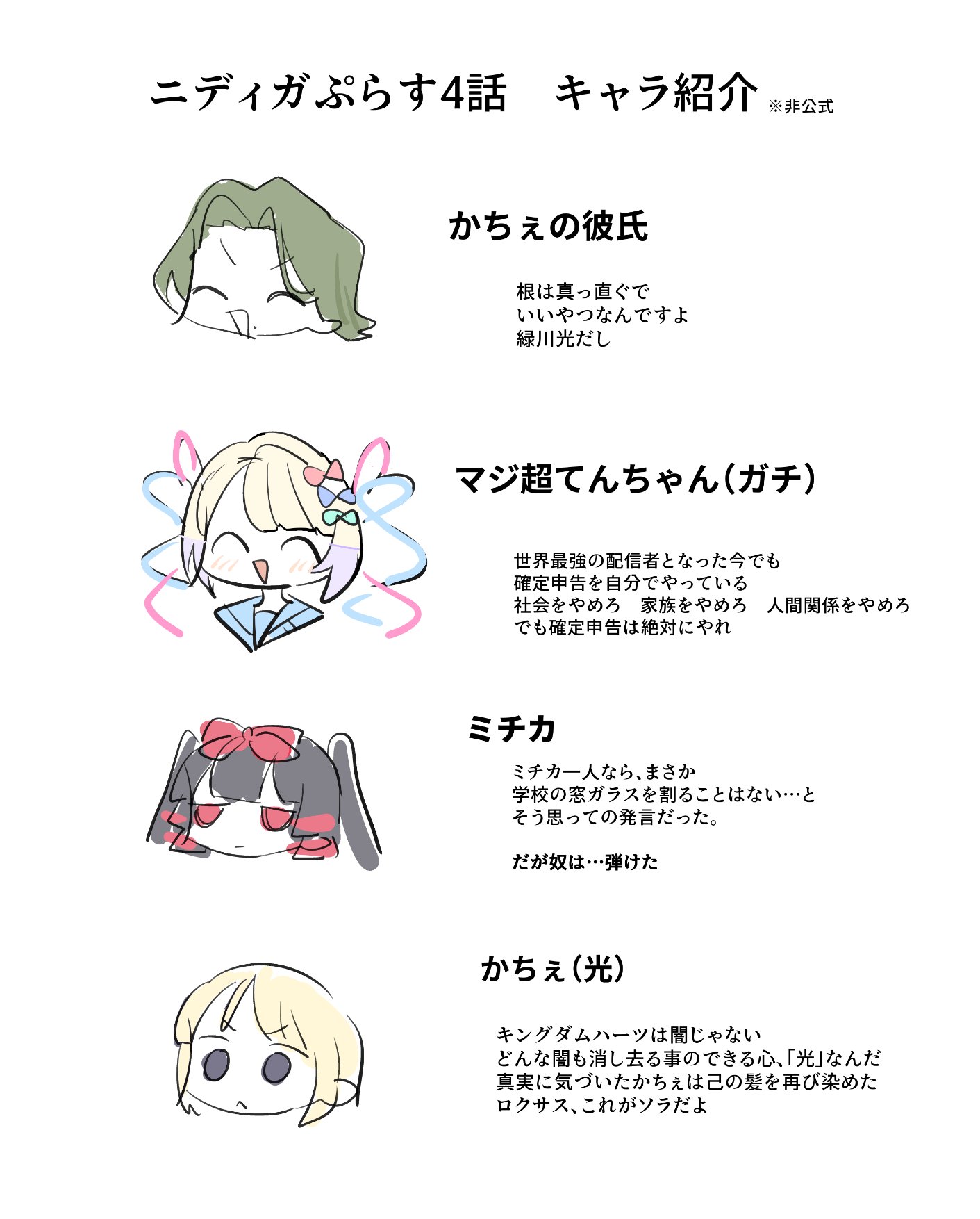 >>287707766They also don't preach as much, for one, and for two we haven't had a good look at them yet, but from what we've seen so farPurple is a (former?) social media addict who still stans KAngel way more than she likes to admit despite talking about defeating her, effectively idolising her as someone above herself despite claiming to be on the same level and in practice dehumanising her despite not dehumanizing herself. She also clearly gets upset by comments and shoots out her frustration, but in general she is probably the sanest of the bunch and a kid who's in over her head. She's generally parroting KAngel too.It's not fully established yet, but GothLoli might be lying to others and to herself. She claims she's just being herself, refusing to conform to the crowds and to care about what others think of her, yet all her actions are a deliberate attempt to draw attention to herself. In her seeming attempt to be a nonconformist she still seeks out the validation of the masses. Based on what we saw in episode 1 her breaking the windows coincided with her quitting school, and if that's true then she clearly wanted to be seen and recognized. She claims to place herself above the masses yet she's only held there because those masses exist. She fails at being a functioning normie but frames it as being enlightened.The last one we know the least about so far, but what we do know is that she approached the gothloli during her moment of mental weakness and tried to do the same with Kache. My personal guess is that she treats her "being yourself" advice to others as "listen to me" specifically. She just seems manipulative and careless. But again we'll need to see more of her and the rest too.