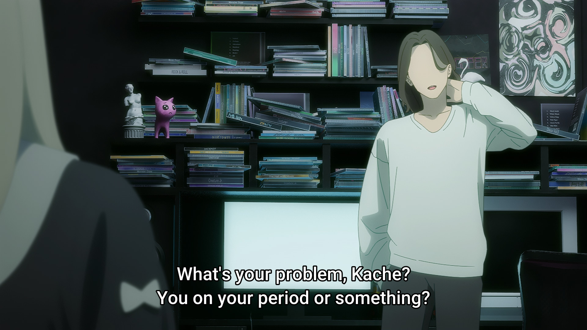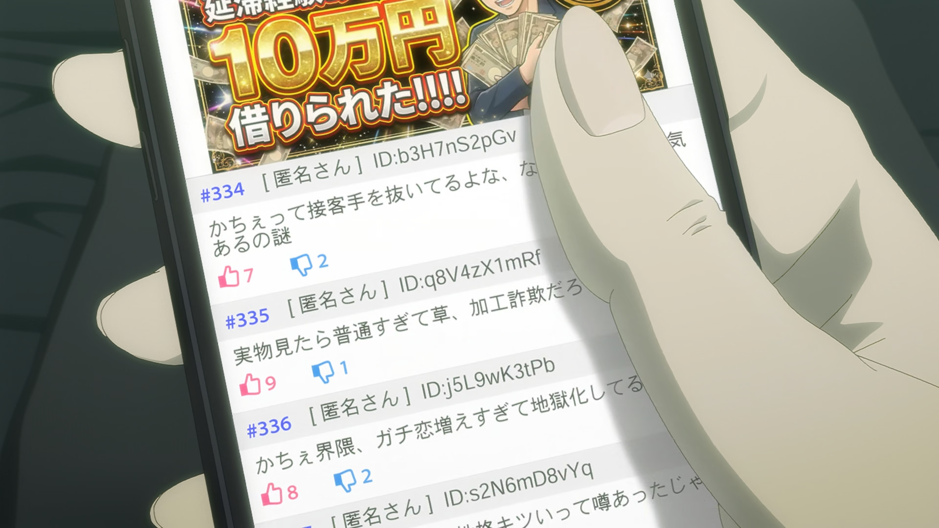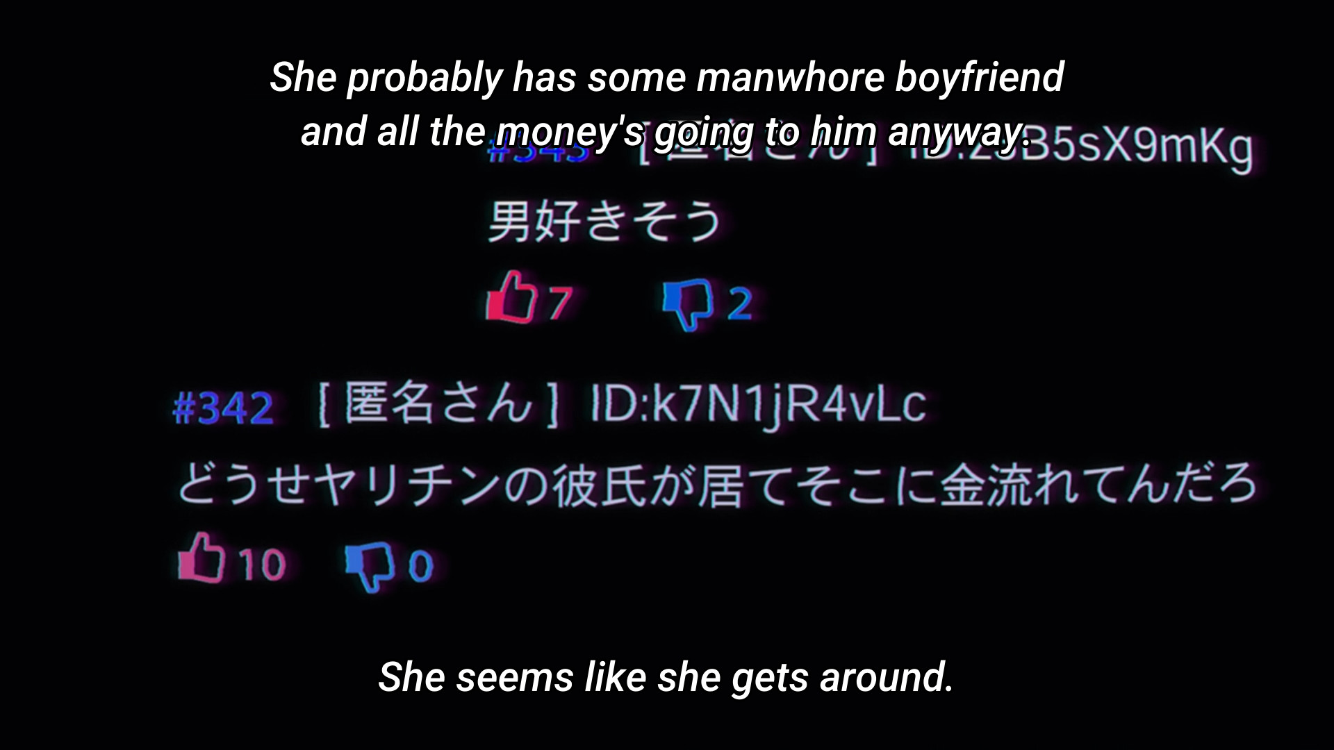 >>287738523>she literally becomes a faceless NPC at one pointYou're an NPC. I'm an NPC. Normal people are NPCs. She sees herself as one in that moment because she realizes the divide between her and her friend, but her friend is not a healthy role model. This is a story about maladjusted individuals incapable of living life happily who cope by thinking anyone else who can do so is simply too stupid to see reality for what it is. Kache's unhealthy need for attention is still there. She's choosing to be who she wants to be, sure, and in general that's not a bad thing, but she's doing it to cover up who she really is rather than reflecting on it and coming to terms with it.She was depressed and pondering suicide even before her bf got scummy. She arguably allowed him to do what he did because she was that apathetic and directionless. Kicking him out is good but it won't address her dissatisfaction towards life. She sent him off by claiming she is better and "above" him, and she needs to rise in popularity and get more attention to make herself believe that's true because popularity is what makes her friend a "star" and validates her individuality.She claims not to care about negative comments yet goes and makes a scene about them. She criticises her bf's band by saying no one even talks about them any more. The truth is that she's clearly stopped caring what type of attention she gets because even negative attention is better to her than fading into normality. Even being hated by the masses still means being above them. But she's absolutely not going back to a regular life right now.