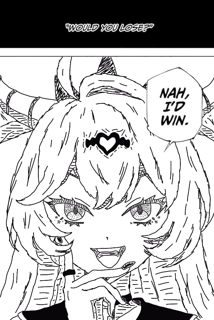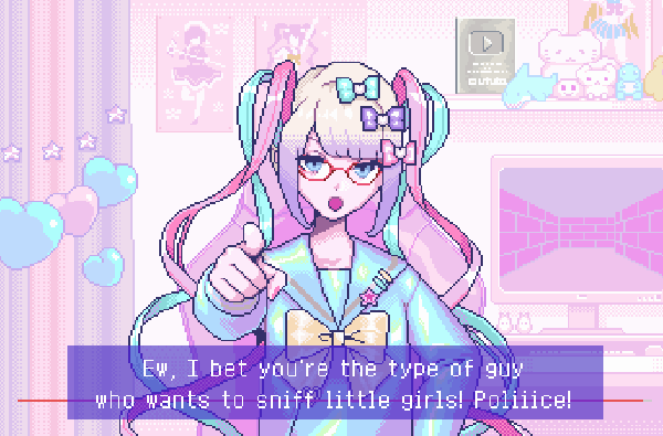 >>287708018Lollipop sees all life situations like it's fiction, plays around with a gun, and most likely had no real friends so her "rivalry" with KAngel is the only way she knows how to socialize. She's not malicious, but she's definitely not what you'd call well adjusted.