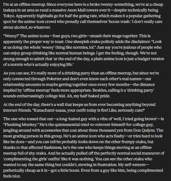 >>287707473219 pages so it's short, but yes it's an actual novel. Inshallah I will translate it with a LLM and drop it on one of these threads, but you can read the first two chapters in the catbox here: >>287706785