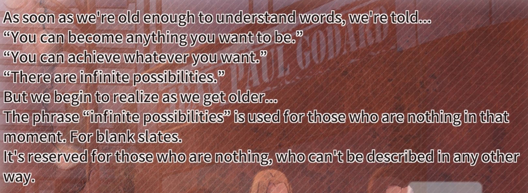 >>287734711>You can become anything" is easy to say when you actually have something.I wonder if he's read tsui no sora >>287721308