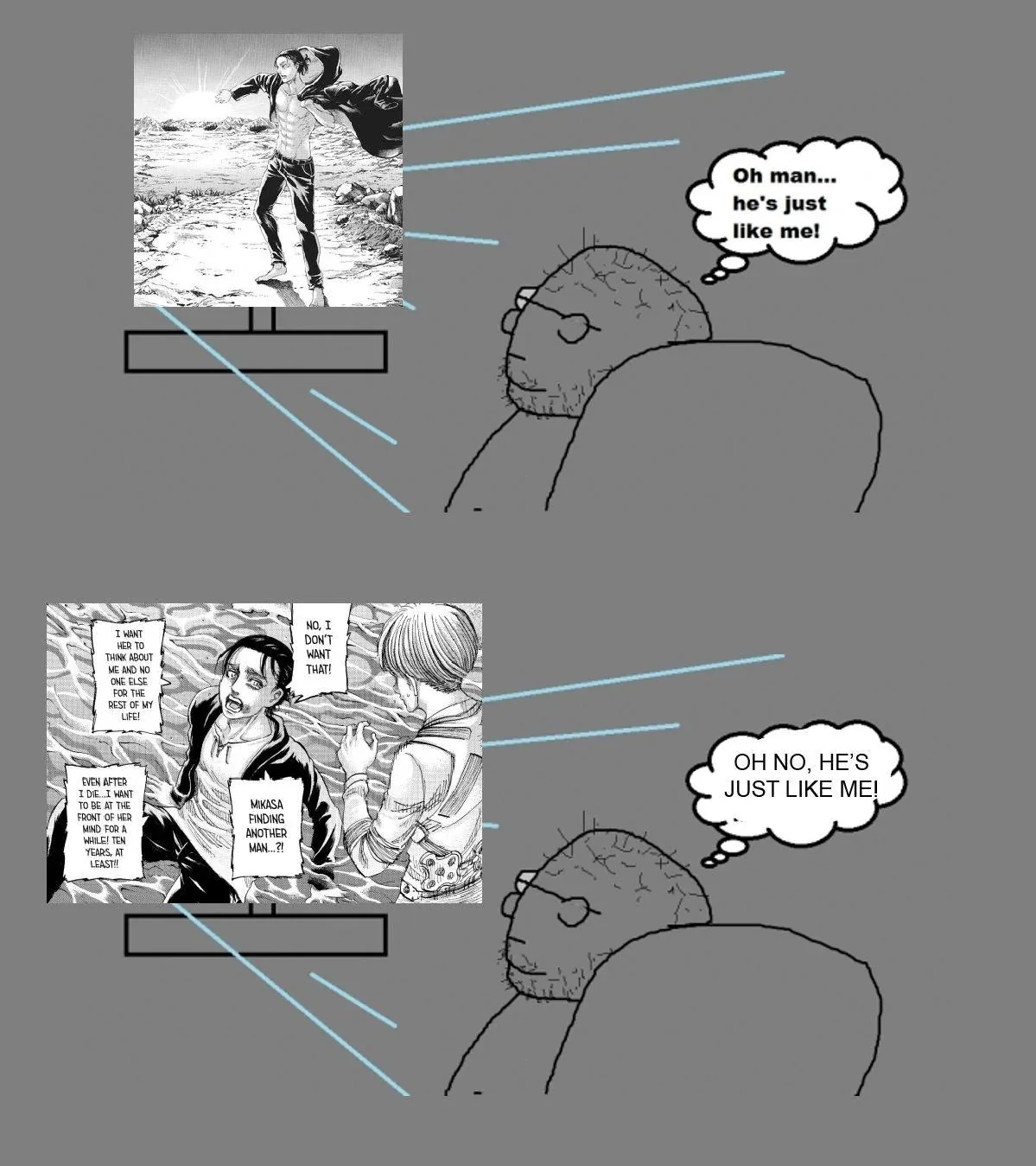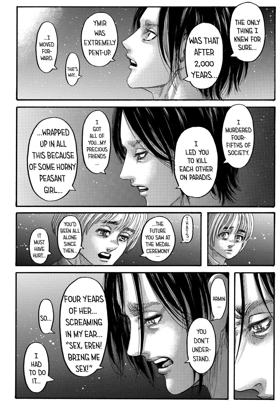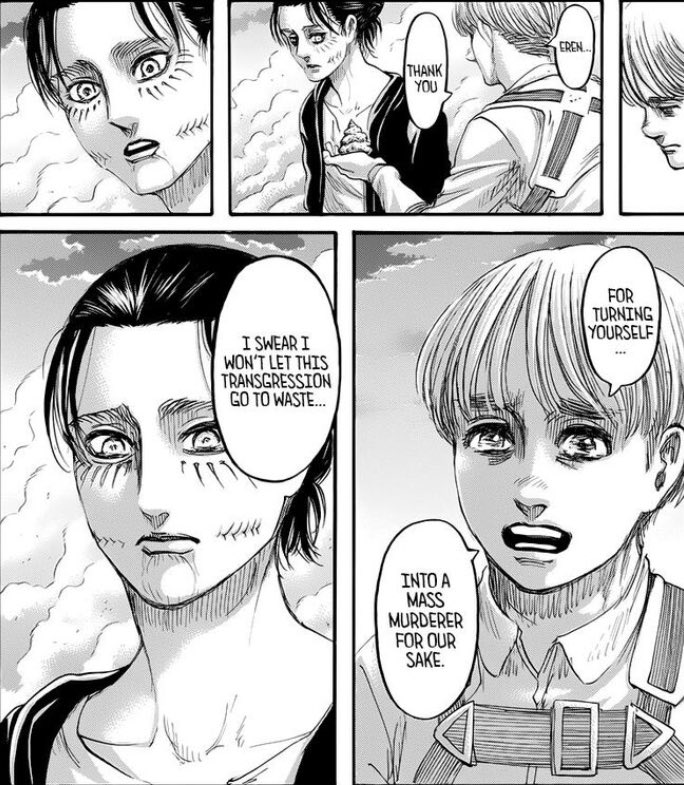 >>287751580> but the big fuel for him is his own disatisfaction with the new status quo that is humanity existing just fine in the world but he himself doesn't get to see or live in this said worldBut thats not the big fuel for him.If it was just that he wouldn’t have gone that far.Yes, he would’ve been disappointed by the world but never wishing for it to be destroyed , at worst he would’ve reverted into the bored kid watching the walls he was before armin went with the book.The thing that drawed him into genocide territory is the imminent threat of destruction that was incoming and him being powerless against it.He literally witnessed atrocities after atrocities until that point, even his own father flashbacks where he literally so the little girl that was his aunt MAULED ALIVE BY DOGS just for existing.And than all of his father’s backstory, on top of witnessing people dying all around.Someone must post again that scene with him wondering about it in chapter 130 (before he cries at Ramzey) ,where he is literally walking across the street full of his future victims, trying to rationalize the whole thing and finding a different way…he realized with disgust and pain it was Kill or be killed (lit. I CAN’T ACCEPT AN END LIKE THIS!).The point of his “I’m disappointed and i want to destroy humanity” in chapter 131 i always read it as a massive coping from his side, where he is trying to regress himself into a kid to force himself into continuing what he knows is a cruel and unfair genocide….that still he is forced to do despite already having forgiven humanity and knowing none of them truly deserve it.It was both the point of Grisha’s original flashback and marley arc, showing eren understood and is not holding grudges…he is just a desperated guy without no other ways left, and by that point he is focussing on it by using the dream of freedom to not lose that focus.going “ i’m bored and i want to kill them all” is as ooc as 139