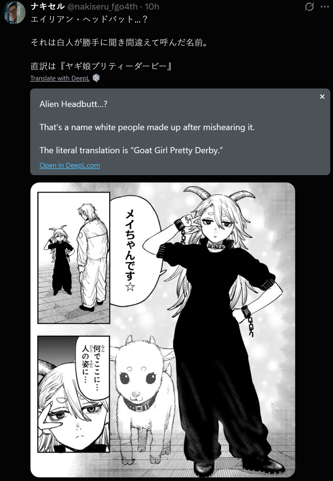 Alien Headbutt is the name whitemen mistranslate and mispronounceThe real name is Goat Musume Pretty Derby
