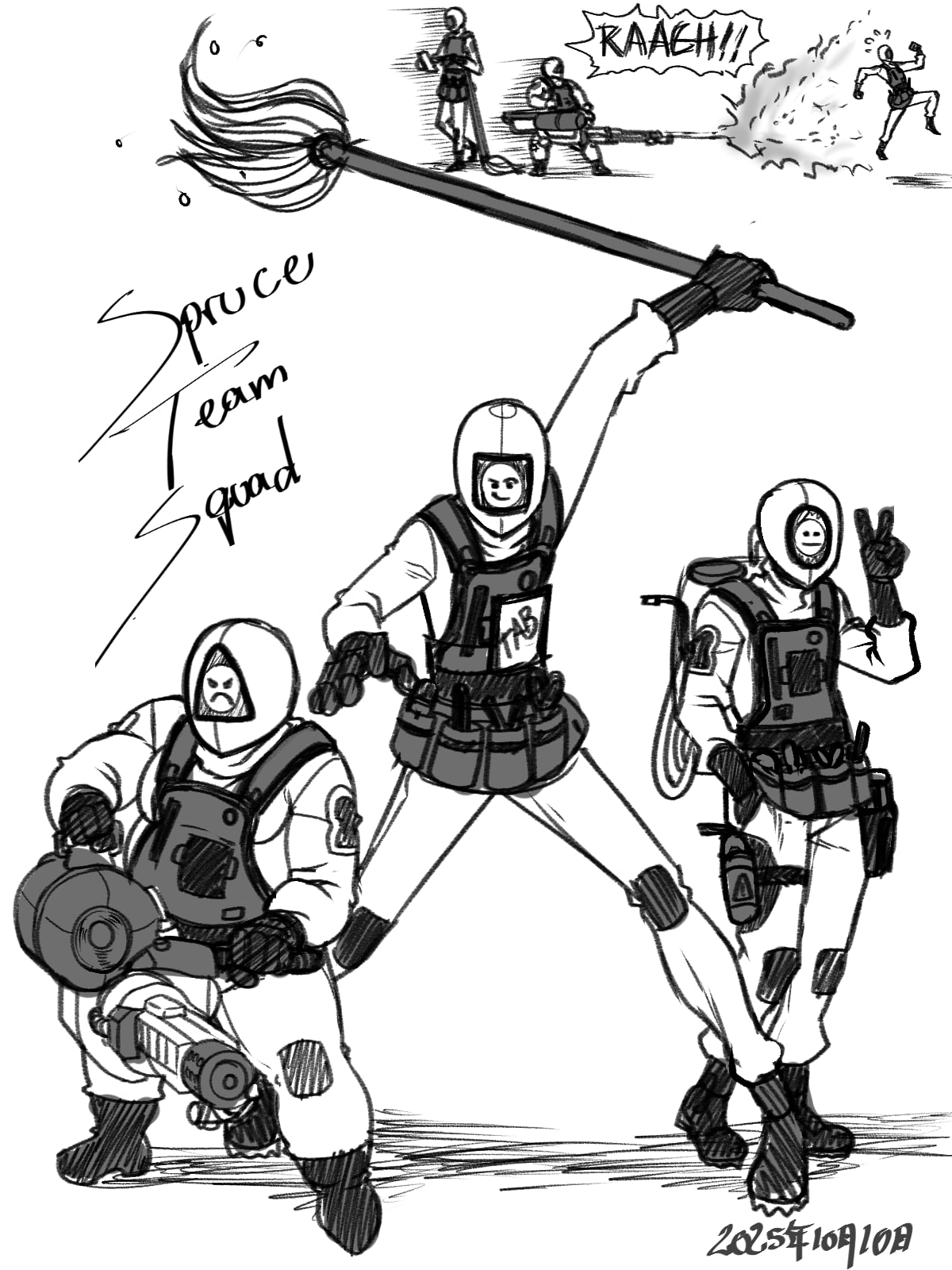 >>9009143We conceptualized a new unit in the comic, Spruce Team Squad whom are the over enthusiastic clean-up team. How do you guys feel about the emoticons for expressions on their visors? Yay or nay for that?