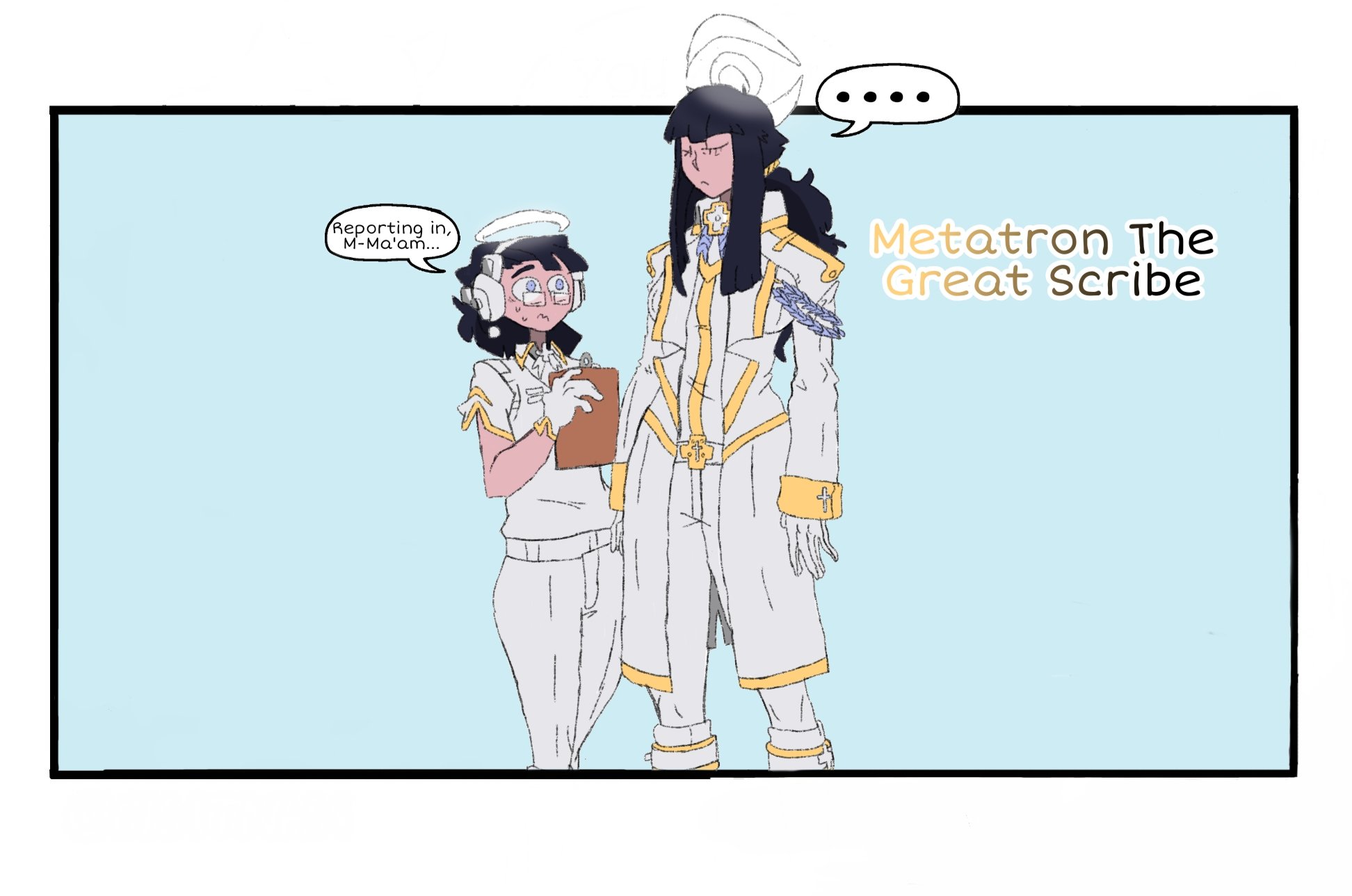 Play this while reading for best results:https://youtu.be/UEbNffWVRro>The angel walked tentatively up to the door to Metatron's room>It was located near the center of the Heavenly Citadel, close to the Throne Room of God>Not many enter her room, and not just because she's hidden from most angels>To those who know Metatron, she's been said to be...>...Creepy>She keeps her eyes closed while talking to you most of the time, although some swear to have seen her eyes open>Still, the angel has a duty to do, report in and hear what Metatron has to say>She just hopes that she's friendlier than others say she is>The angel knocks on the door three times>"Come in.">The angel opens the door, and almost runs right back out>Metatron is standing up, and she is TALL>She has got to be 7 feet, at least>Her eyes are closed, as though she is asleep>The angel attempts to gather herself together, and speaks>"Reporting in, M–Ma'am...">Metatron did not speak for several seconds>While she was waiting for a response, the angel could only hear the ticking of the clock on the wall, loud amidst the silence of the room1/2