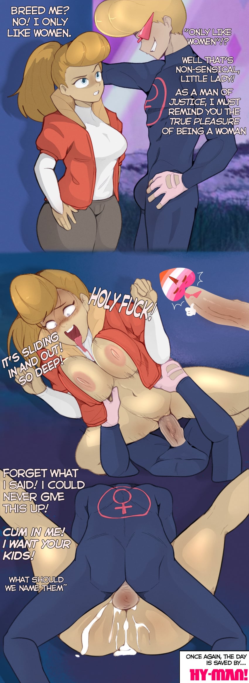 Lesbians realizing mid-sex how handsome and appealing men are in waves of lust, the musk and body hair and rippling muscles, the warmth of his hands on her hips and that filling, tickling, itch-scratching cock full of babymaking seed knocking at the door of a needy womb. All the hesitation and anxiety melting away in the all-encompassing good of how it feels to fuck straight, and how right it feels when he cums a baby inside her.