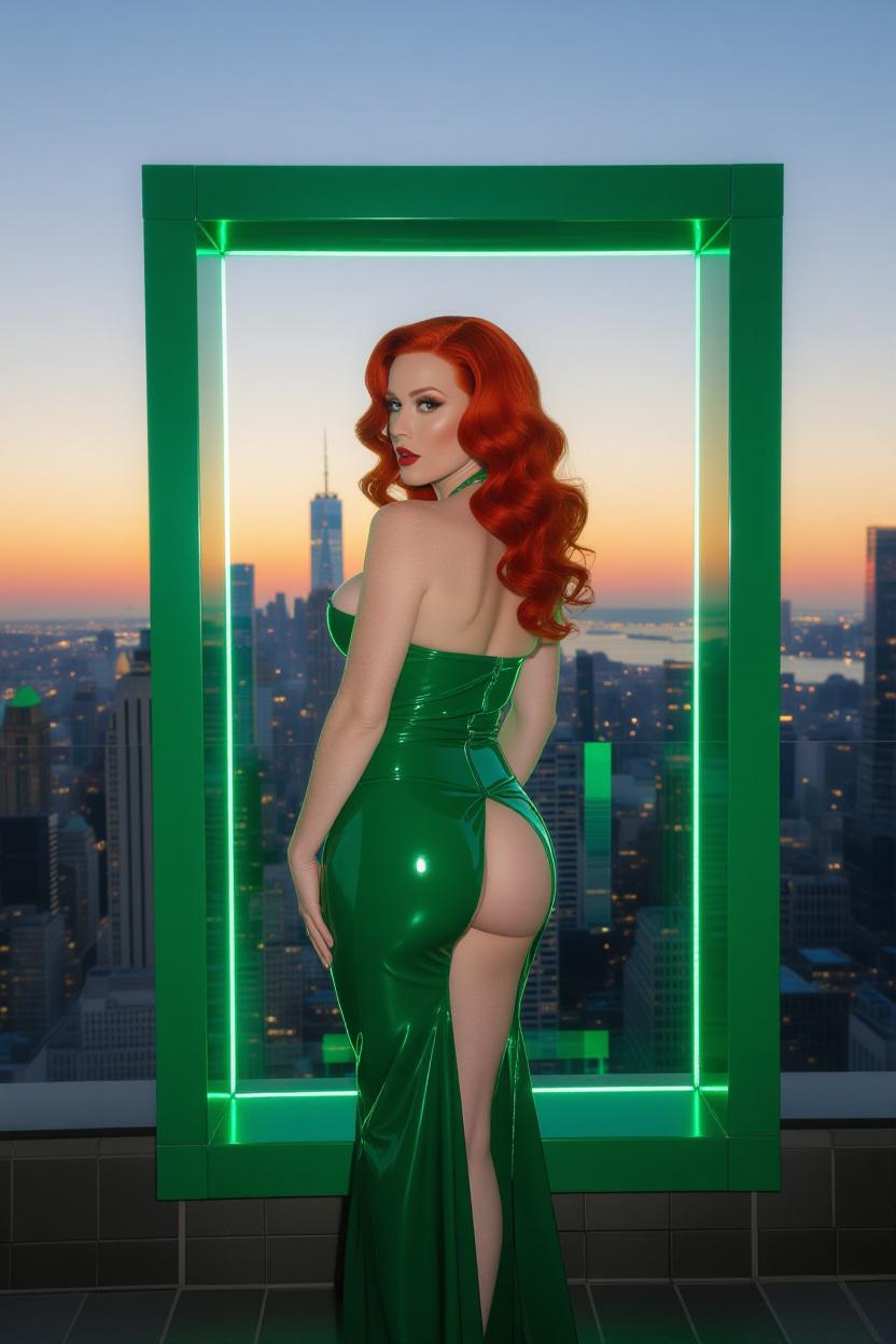 >>9015839>>9015848>>9015849>>9015850the initial propt for this pictureA Katey Perry look-alike with fiery red curls and a naked bottom, wearing a reflective, emerald green latex dress with boobs hidden, framed in a wide-angle composition with a vibrant cityscape backdrop at dusk
