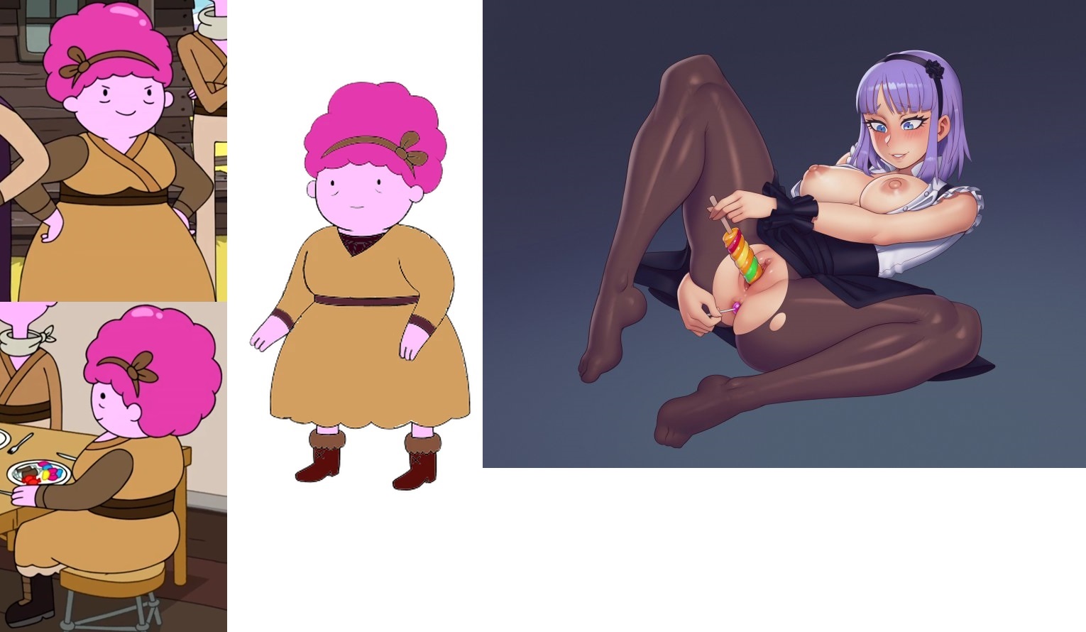 Requesting Aunt Lolly lying on her back and looking naughtily at the viewer, licking one lollipop and using another to rub her pussy, with a third stuck up her asshole.