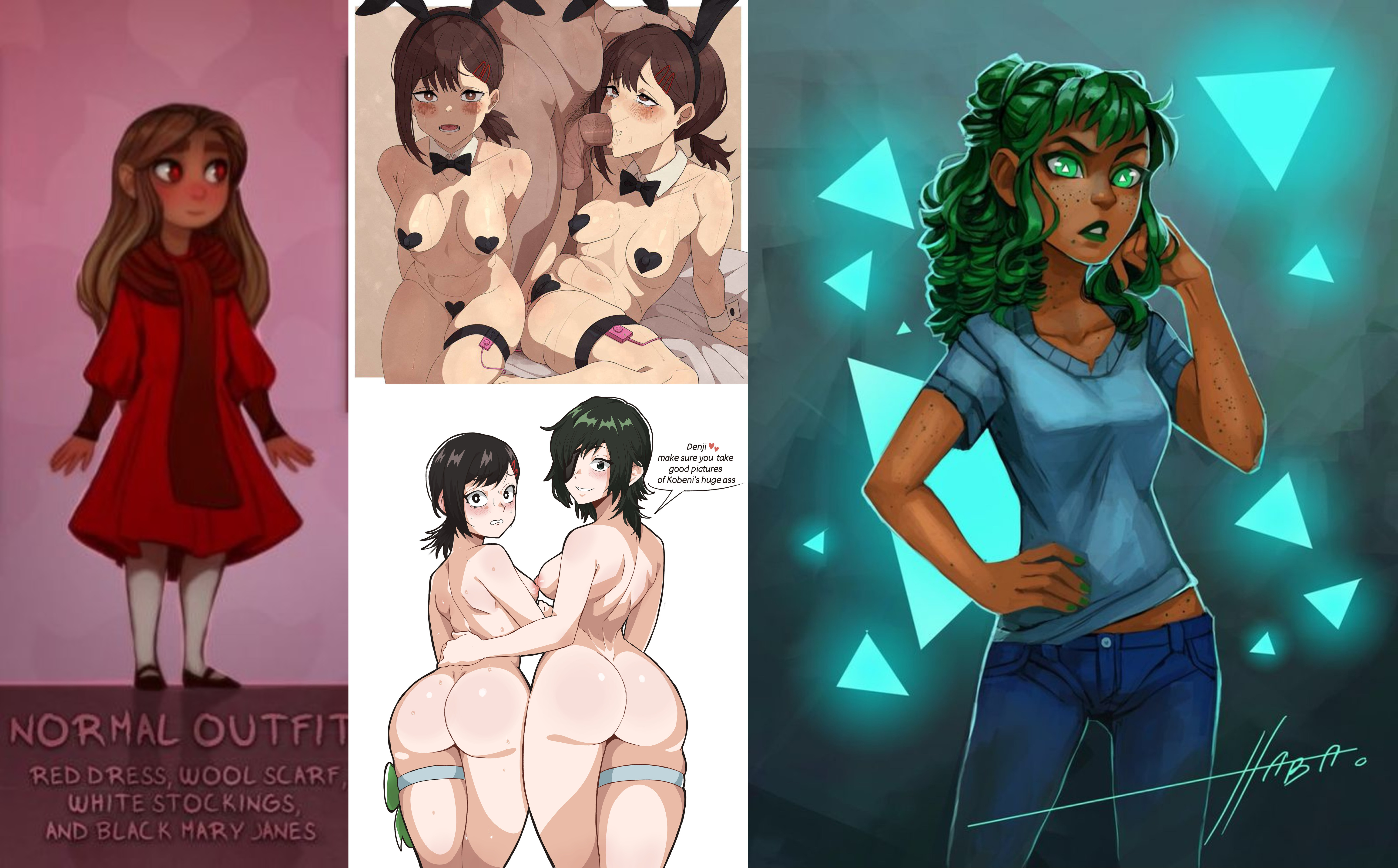 Requesting aged up Hat Kid and Bow Kid both sandwiching a guy's dick with their pussies.