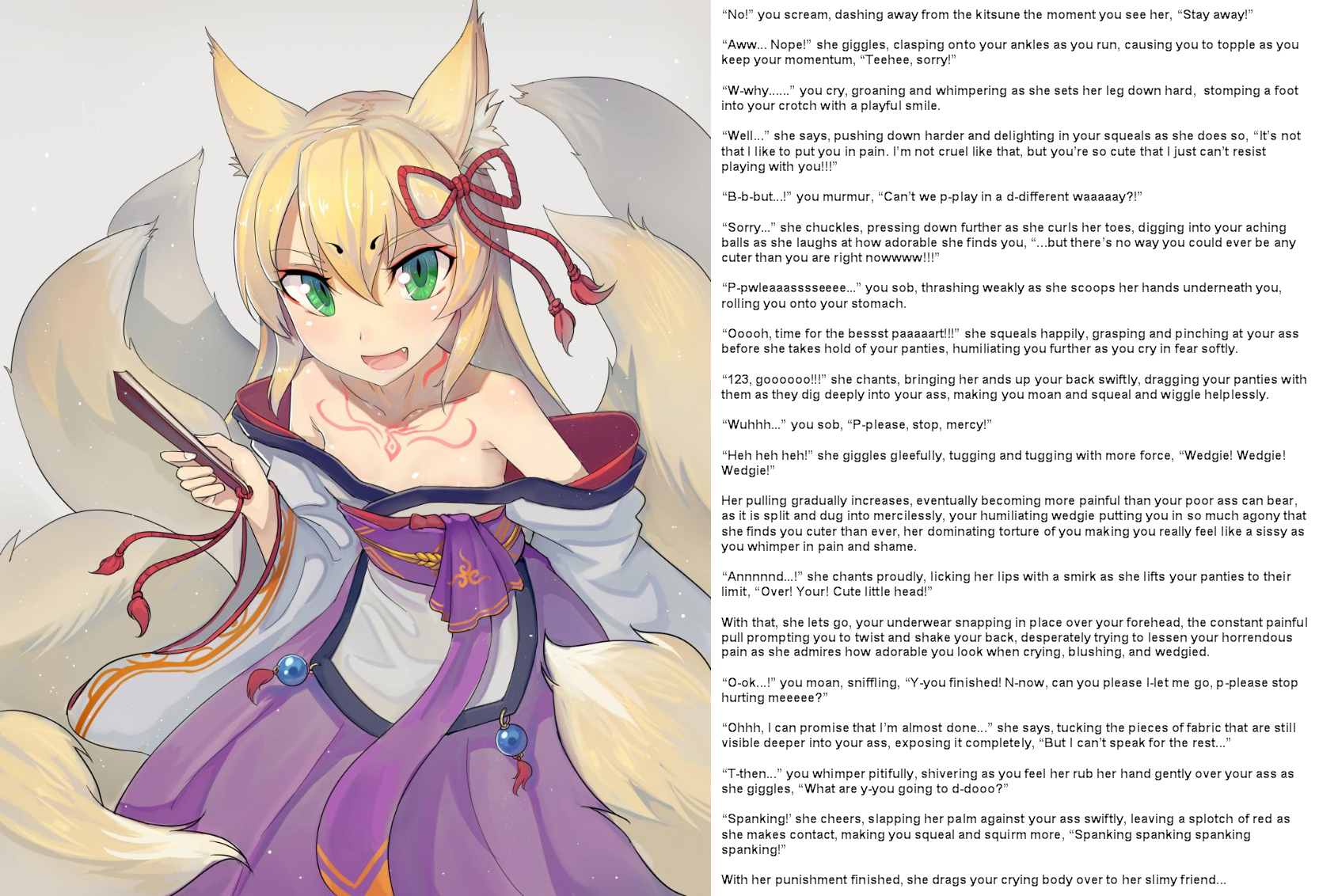 >>9025615Agreed on the moons thing. Too many smut writers think they need to invoke purple prose to break up the repetitiveness. It's always goofy at best and just a total literary cockblock at worst.And yeah, brevity is good for this kind of smut. It's a hard balance though, I'm tired of finding Deviant Art stories that have an interesting title and tags but are just five paragraphs.Personally I prefer my harsher treatment but I'm also just into BDSM stuff in general so for me this whole fetish is just an interesting way to express it. It's a very humiliation oriented one.