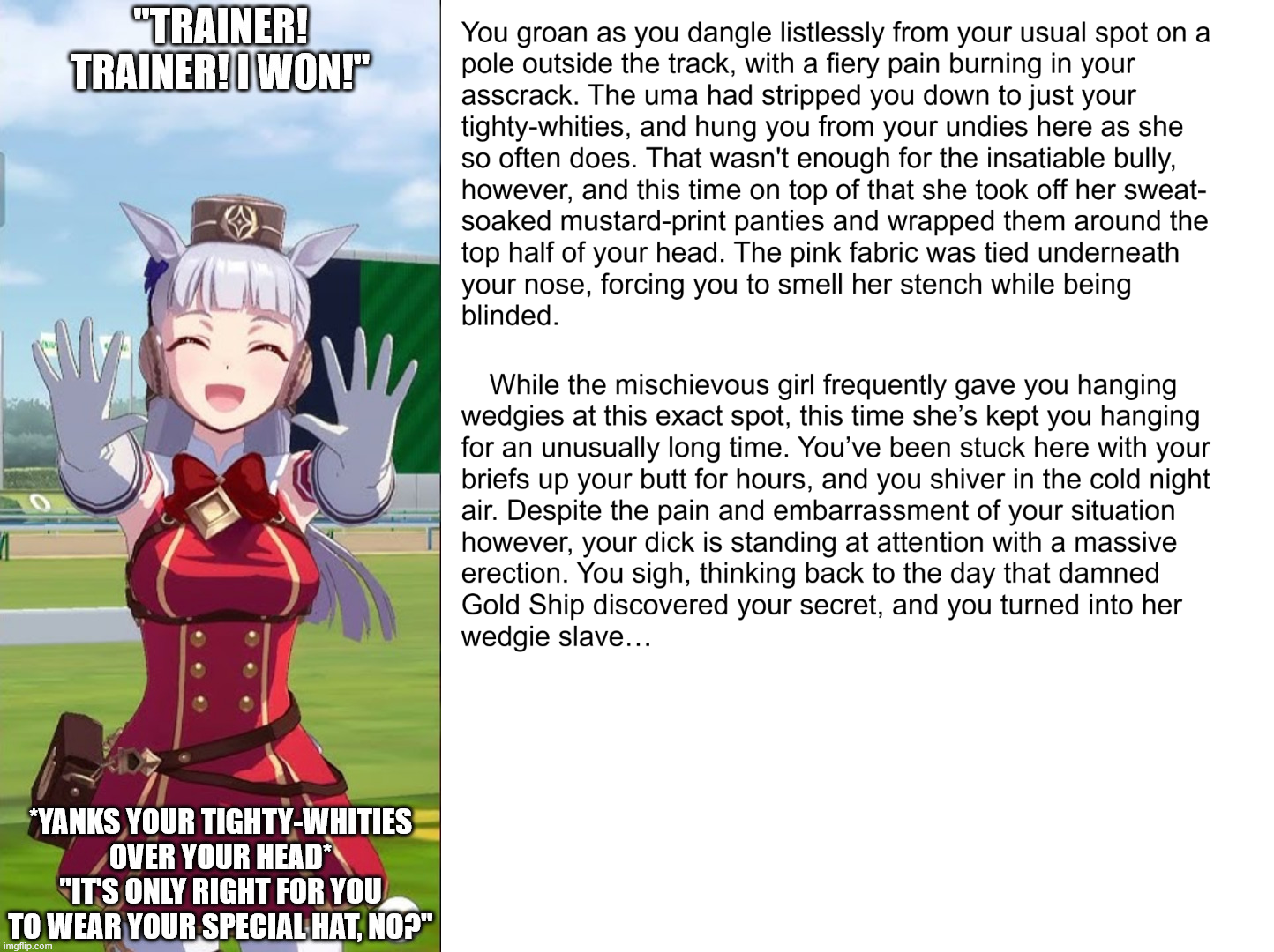 >>9025069The other simple challenge is that it's ironically hard to stretch "My underwear is being stretch high!" over a decent amount of words. Only so many techniques, only so many ways you can say "My ass hurts!", only so many interesting scenarios, etc.Triad9 already wrote a peak flagpole wedgie story, how many more can reasonably be written, yeah?Of course you can replace a character with your favorite anime waifu or maybe spice it up with other bullying techniques like swirlies, but still.Not to say it's impossible, it's just hard to be motivated with such limitations. Especially with this community being what it is: not interested in helping artistic growth or just not being hostile to genuinely enthusiastic people.Oh and of course the unavoidable reality that it's an admittedly kind of cringe fetish with adjacency to forbidden-on-most-websites content without having the weirdly large devoted following as diaper stuff.Personally in my experience writing, it's hard to write those first paragraphs giving a decent set-up that isn't boring, and it's hard to actually write the action that isn't a constant reiteration of undies burning butts, and it's hard to give a satisfying conclusion, and it's really hard to do all of that without copying something better. Now try staying hard while writing all that erotica and yeah, it's some shit.At the moment I'm writing a whole novella myself, with a monster boy in a summer camp being captured by monster girls at an adjacent camp. That also leads into the fun stuff of "When does the bullying go too far? When does the suspension (heh) of disbelief break when a teacher or otherwise break up the bullying? How much pain or humiliation can you do before it stops being horny and starts just being sad?"It does help to keep the wedgies themselves cartoony but describing someone as having tears pouring down their face from the wedgie humiliation might not get everyone going regardless of how silly the underwear looks.