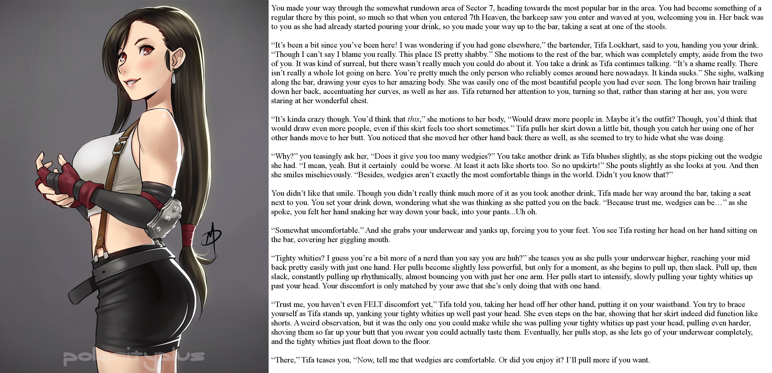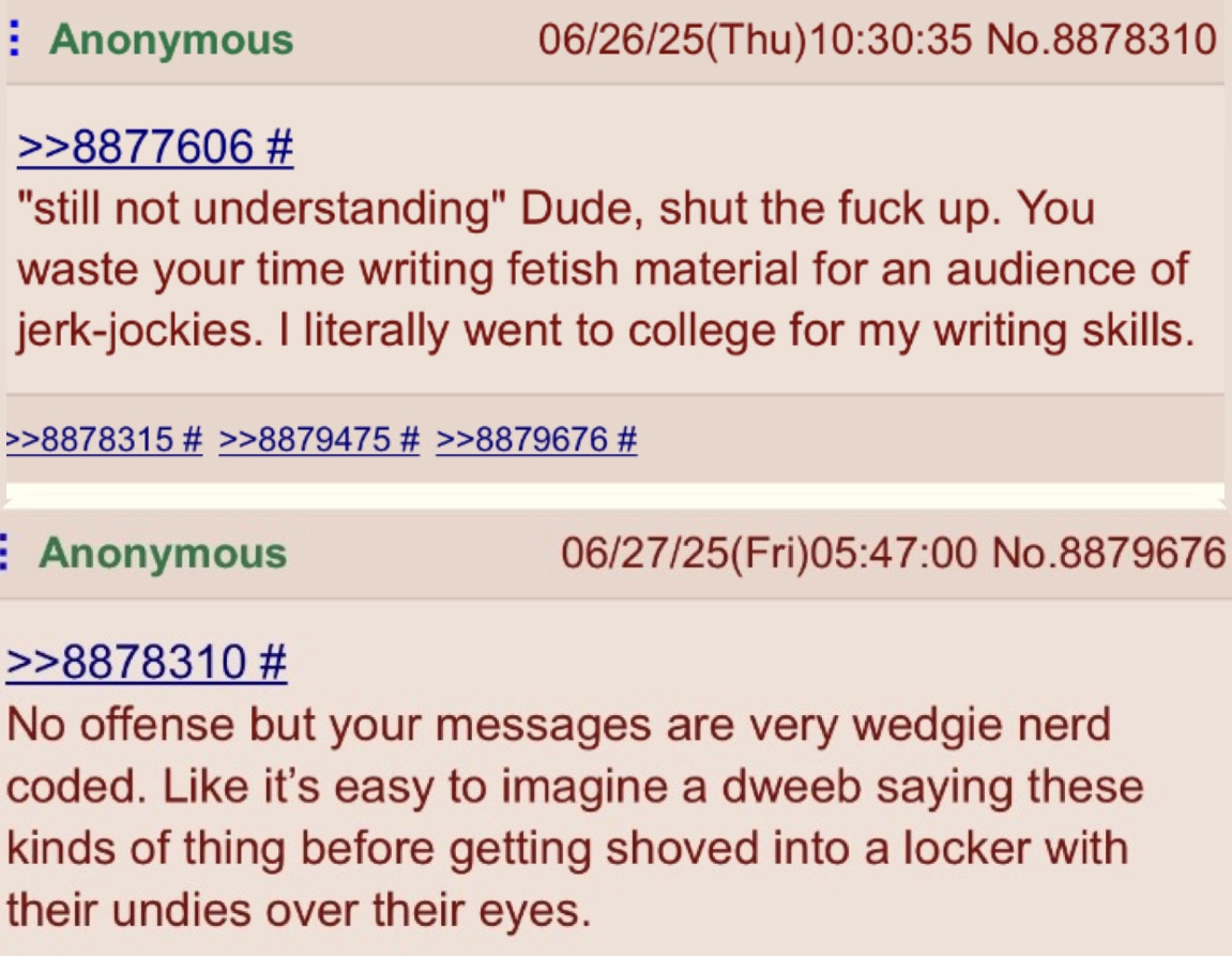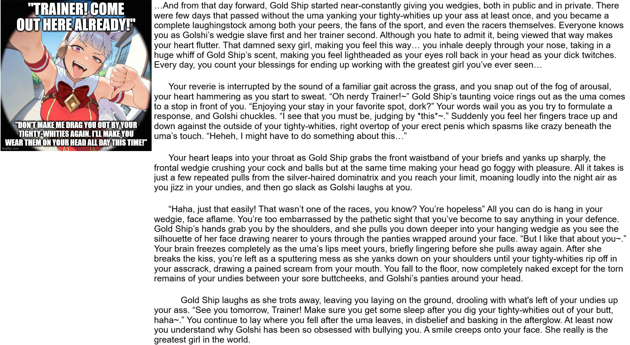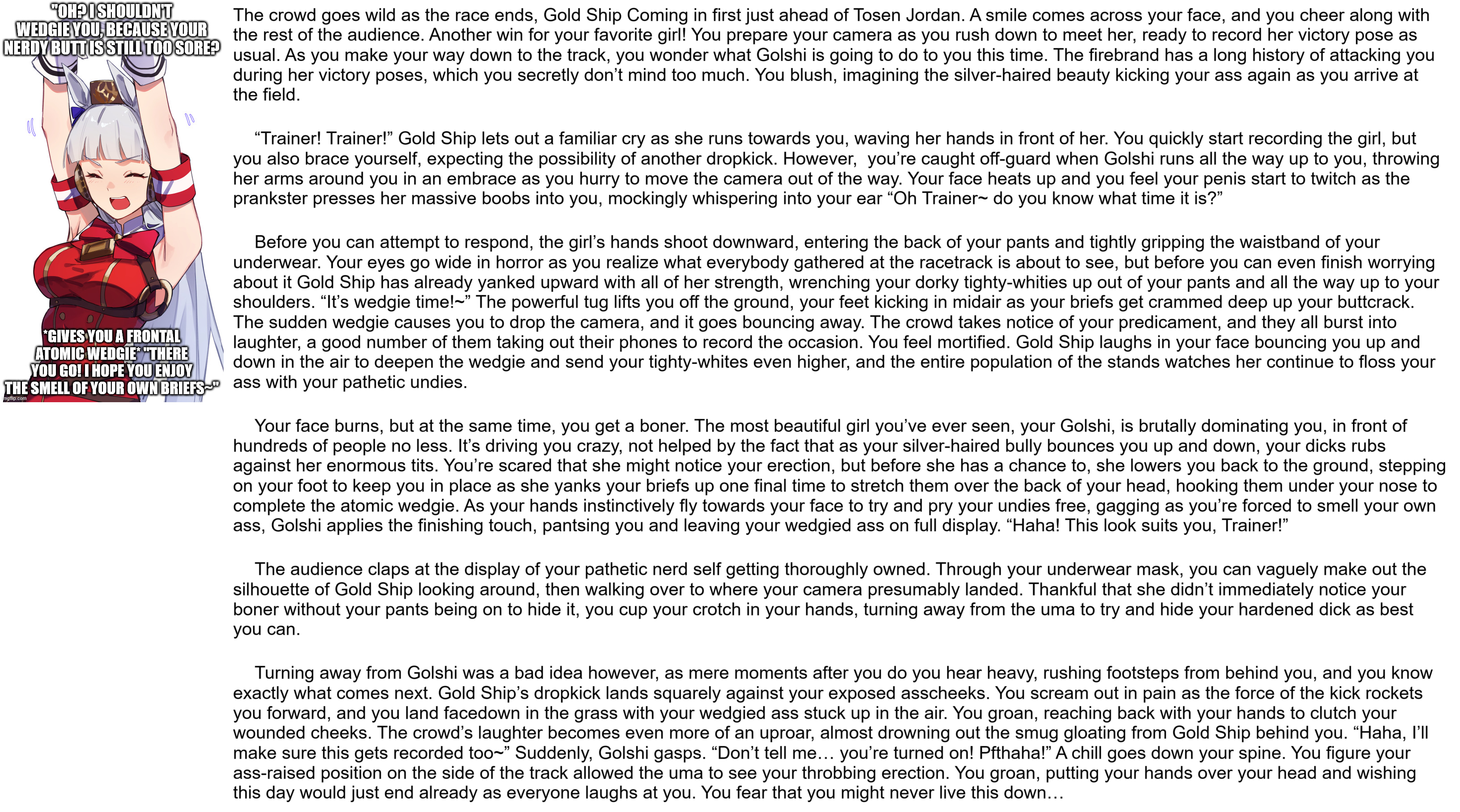 >>9025527Those are all good points.It also brings up the thing where in the end of the day this is smut and authors should treat it as such. Of course there is well written smut and then there's bottom of the barrel trash smut. But authors should keep in mind that most people reading these stories are reading with one hand, and the wedgies should be the stars. As this thread has mentioned, there are novel length stories out there now. And although they are better narratives than most, I'd argue that they're not nearly as good smut content. Take triad9, his short stories are probably much better goon material for most. You can use a wedgie story as a framework to write a great coming of age story, but your average guy just looking for material to jack off to doesn't want to read thousands of words before cotton is finally exposed. So there's a nice catch 22 in there. Personally I much prefer stories where I actually like the characters, makes everything better. But I'm also an avid reader in general.And the level of bullying itself can range so far within the community. Like me personally, I like to keep it cartoony, PG13 is that sweet spot. Other people want the girl to get stripped and fucked and all that and make it basically a bdsm book with the main character practically traumatized daily. So you're writing for a niche within a niche and the group of people that are looking for exactly that is tiny. Put in all that effort for a hundred favorites and five comments on deviantart. I wish this community was more supportive of new writers. But unfortunately it's mostly unhelpful criticism "this sucks bro". Or basically just a request they spam on every story that's not terrible. "Love your story dude. But maybe next time you can have them pants her and spank her with a 3.5 foot bamboo stick while singing London bridge, also she should be this anime girl I like"Side note. Anyone who uses the words "two pale moons" should have their hands cut off.