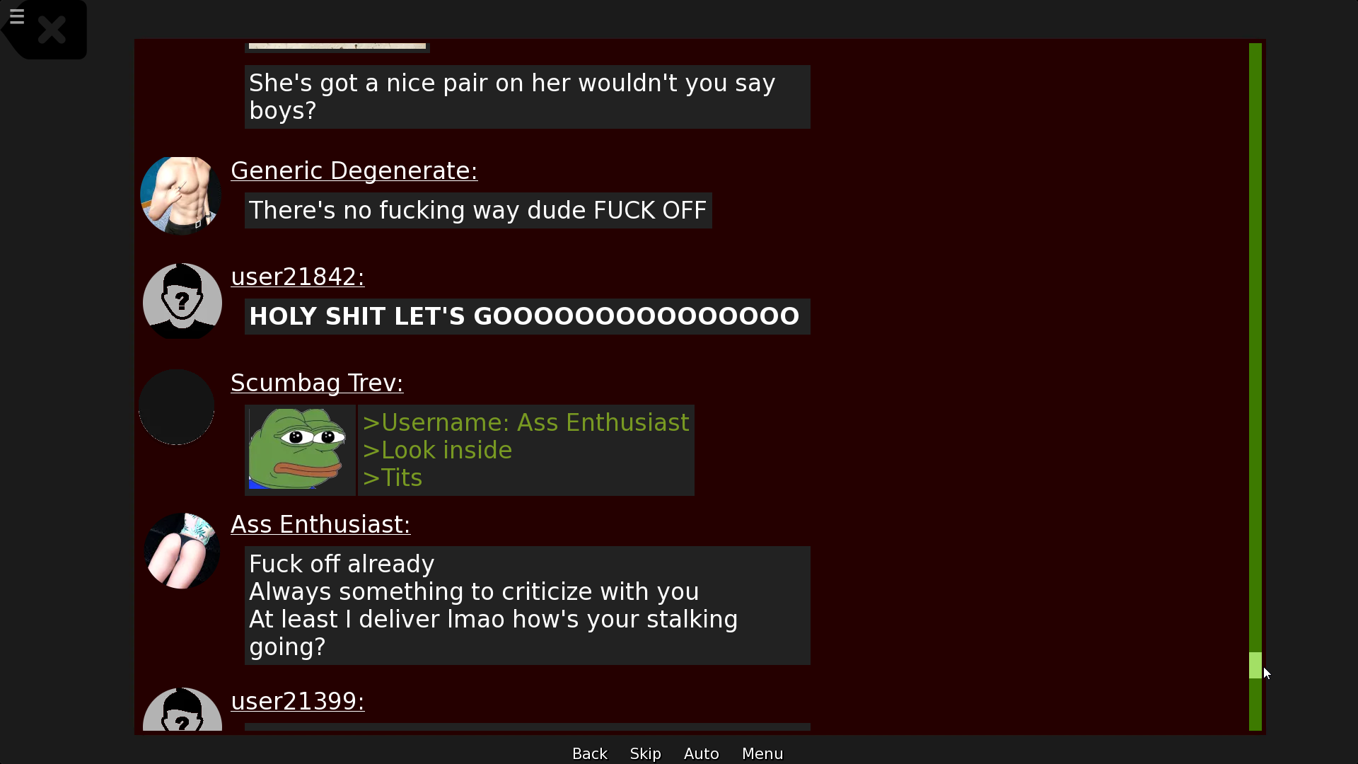 >>9033901>>9033906I played this game today and it was funny as fuck. The whole gimmick is that there's this forum where guys post about chicks they're going to bang and every single post on there was always gold.
