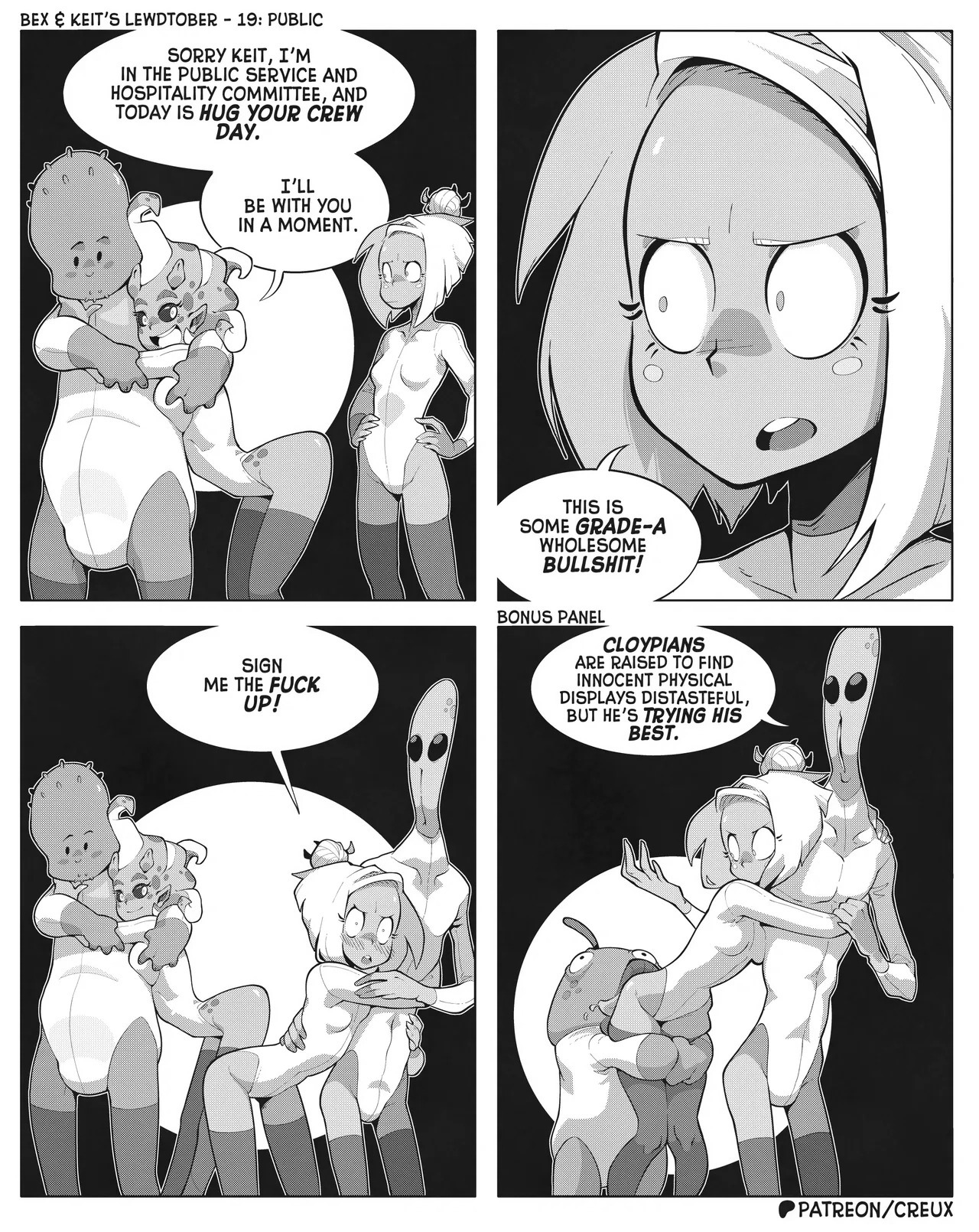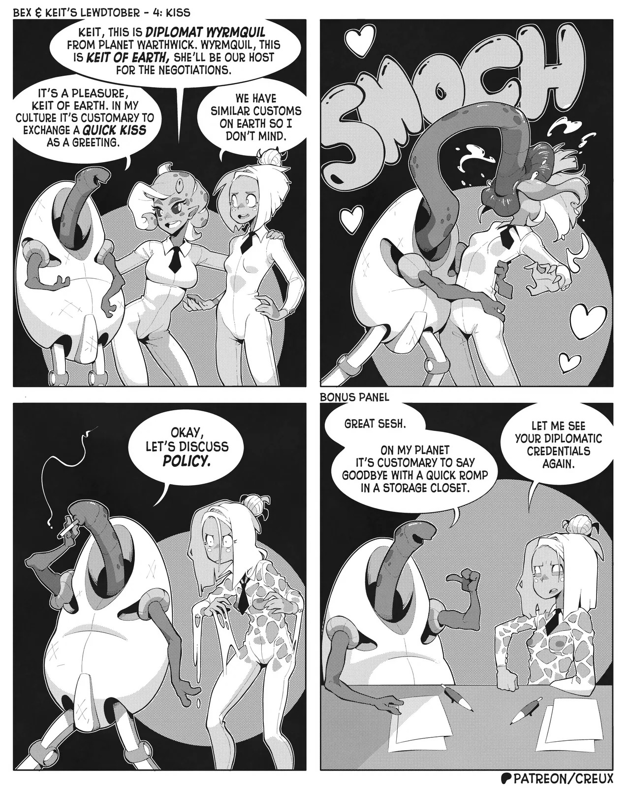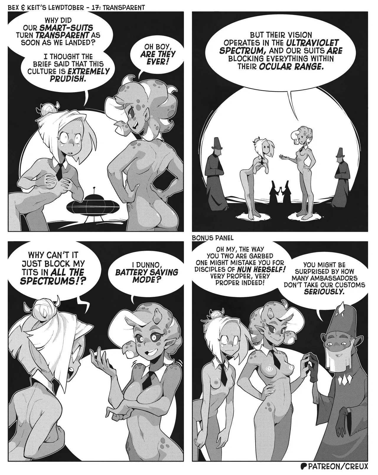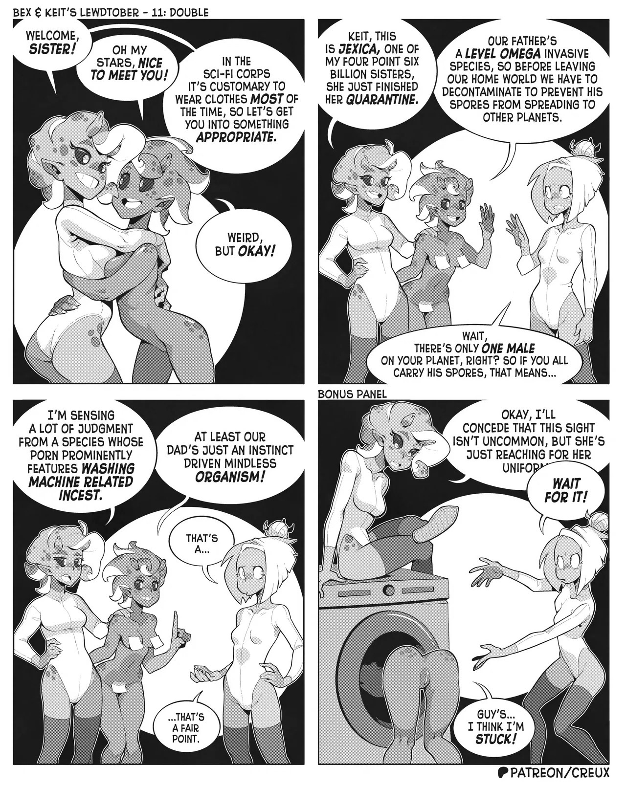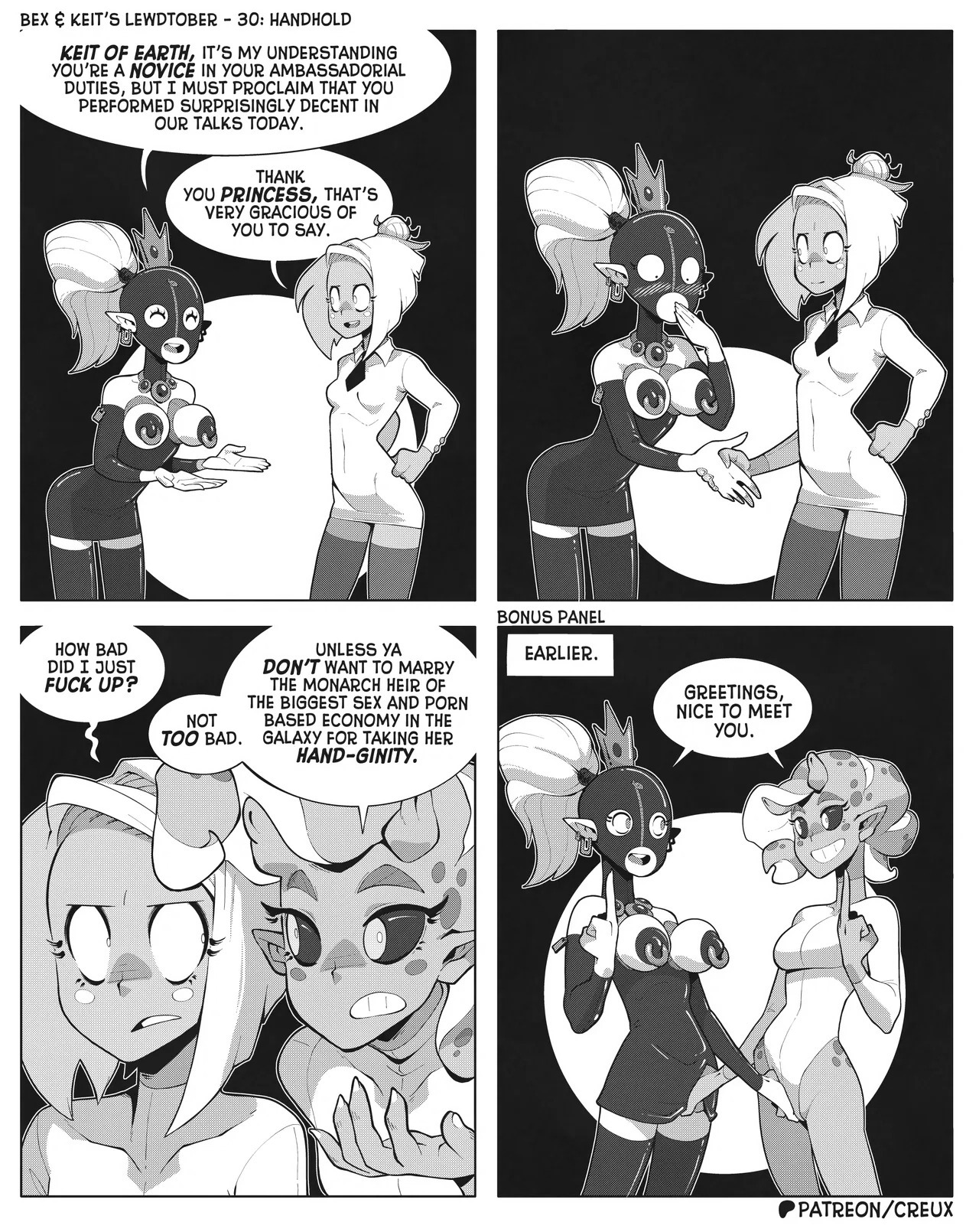 Some frog in Canada who I'm pretty sure used to make the "Two Guys And Guy" webcomic is making more money lately drawing ecchi stuff. This is what he did for last year's october drawing prompts.Keit (the blonde Earthling) got alien-abducted by mistake, but rather than send her home the aliens added her to their diplomatic corps, visiting other worlds for check-ins and second-contact type stuff.