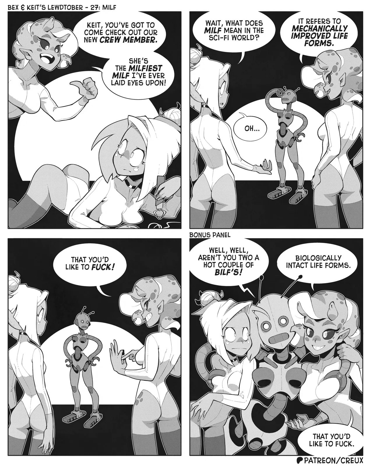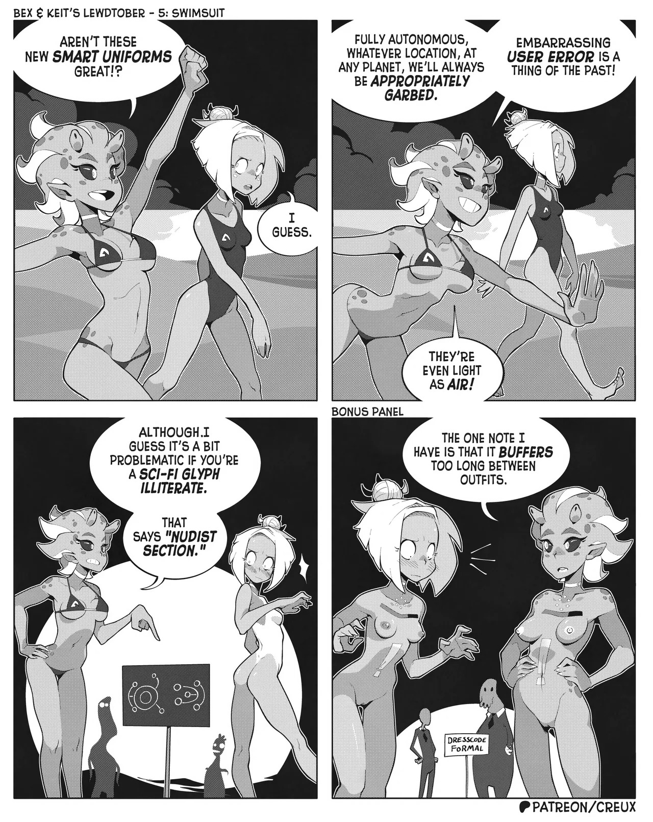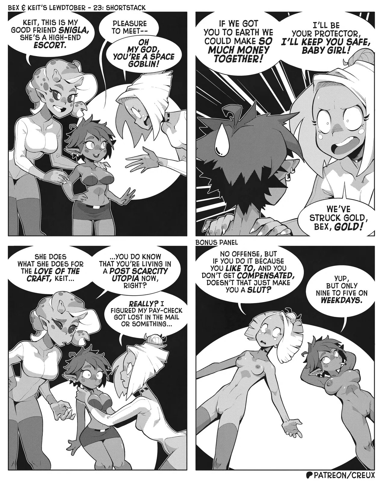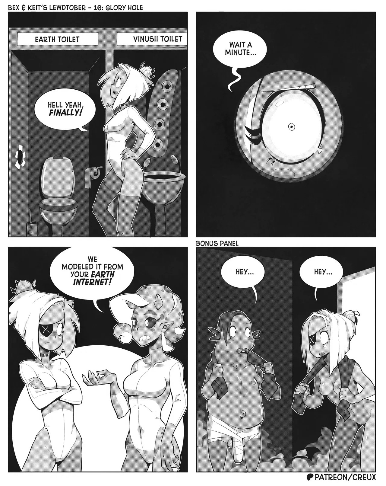 Some frog in Canada who I'm pretty sure used to make the "Two Guys And Guy" webcomic is making more money lately drawing ecchi stuff. This is what he did for last year's october drawing prompts.Keit (the blonde Earthling) got alien-abducted by mistake, but rather than send her home the aliens added her to their diplomatic corps, visiting other worlds for check-ins and second-contact type stuff.