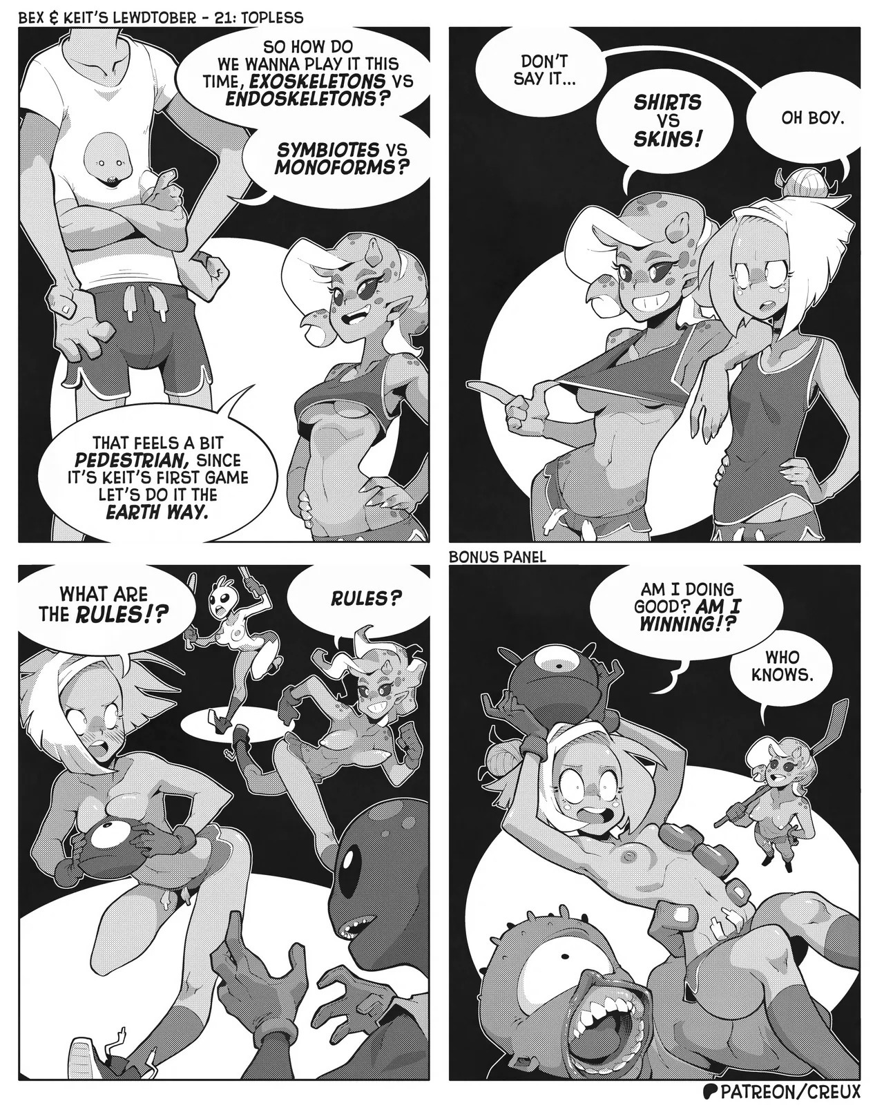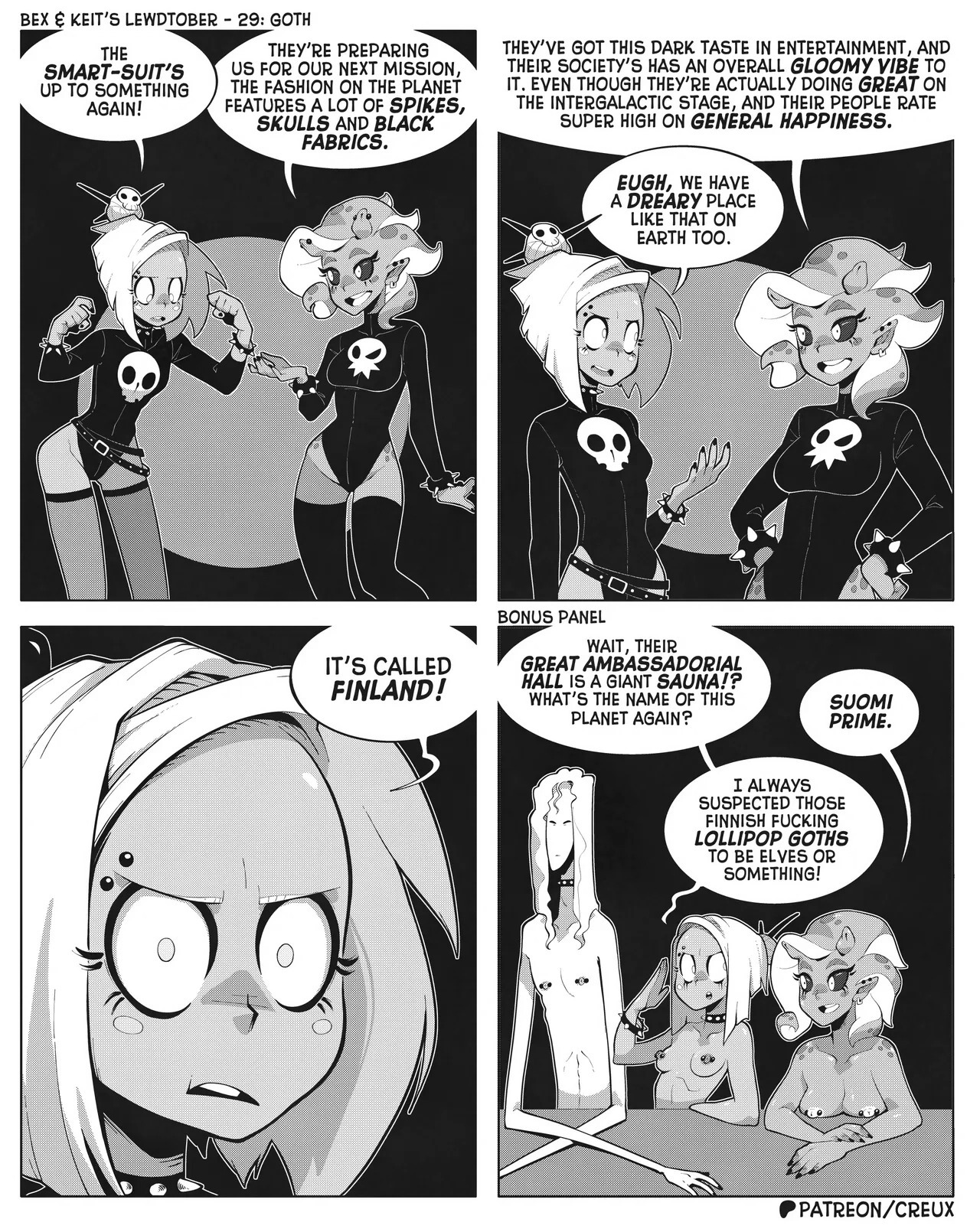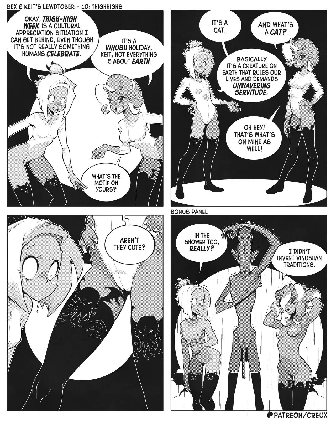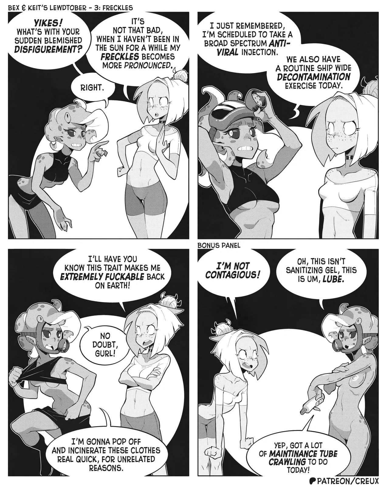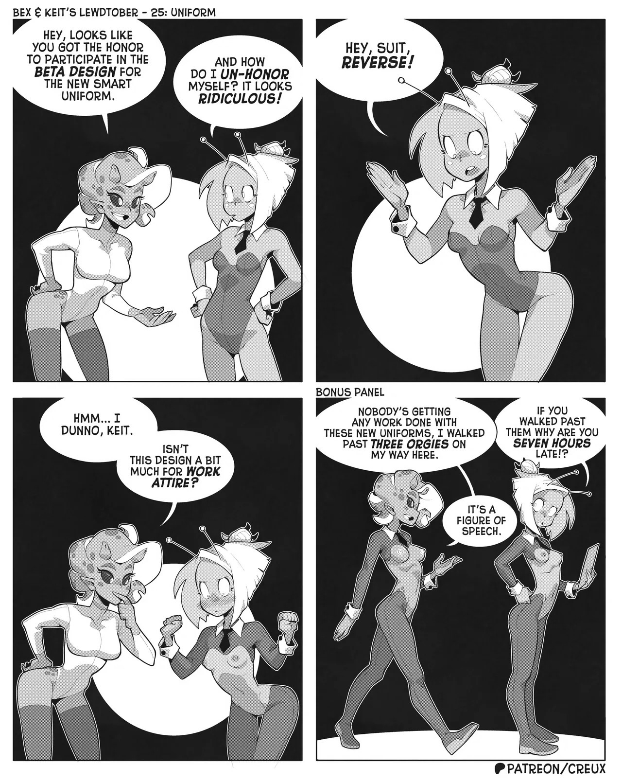 Some frog in Canada who I'm pretty sure used to make the "Two Guys And Guy" webcomic is making more money lately drawing ecchi stuff. This is what he did for last year's october drawing prompts.Keit (the blonde Earthling) got alien-abducted by mistake, but rather than send her home the aliens added her to their diplomatic corps, visiting other worlds for check-ins and second-contact type stuff.