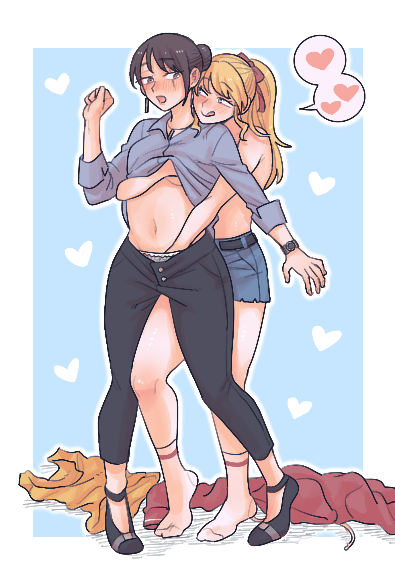 >>9142908Hearing you talk about my OCs like this is really hot ngl. Havent had someone lusting over them like this before hahaThe idea is that something got sprayed on her and it ate through her clothes. I have one of Faye in the same situation. Dont really have much of a story for Faye or Lina per say more just some scattered ideasBoth would be Bi in my eyes and with all the art ive gotten of them so far. Faye is easily embarrassed when it comes to sex stuff so she wont really "fight back" when a guy or girl makes a move on her. Contrast how in any other situation shes the Mature and Organized one.Lina is much more comfortable with sexual encounters and in a away helps Faye to "Open Up" and relax more.Not officially a couple but they're more than friends and live together.Those bondage outfits you posted are really hot. May get one or both of them in it at somepoint