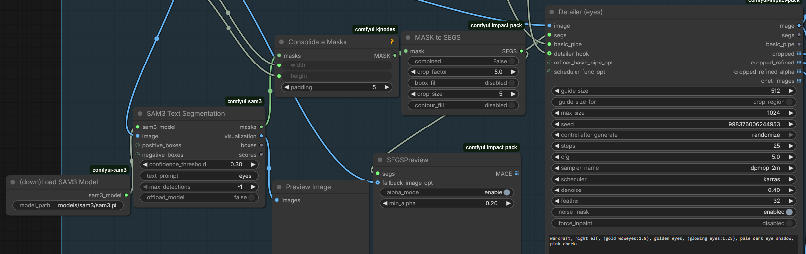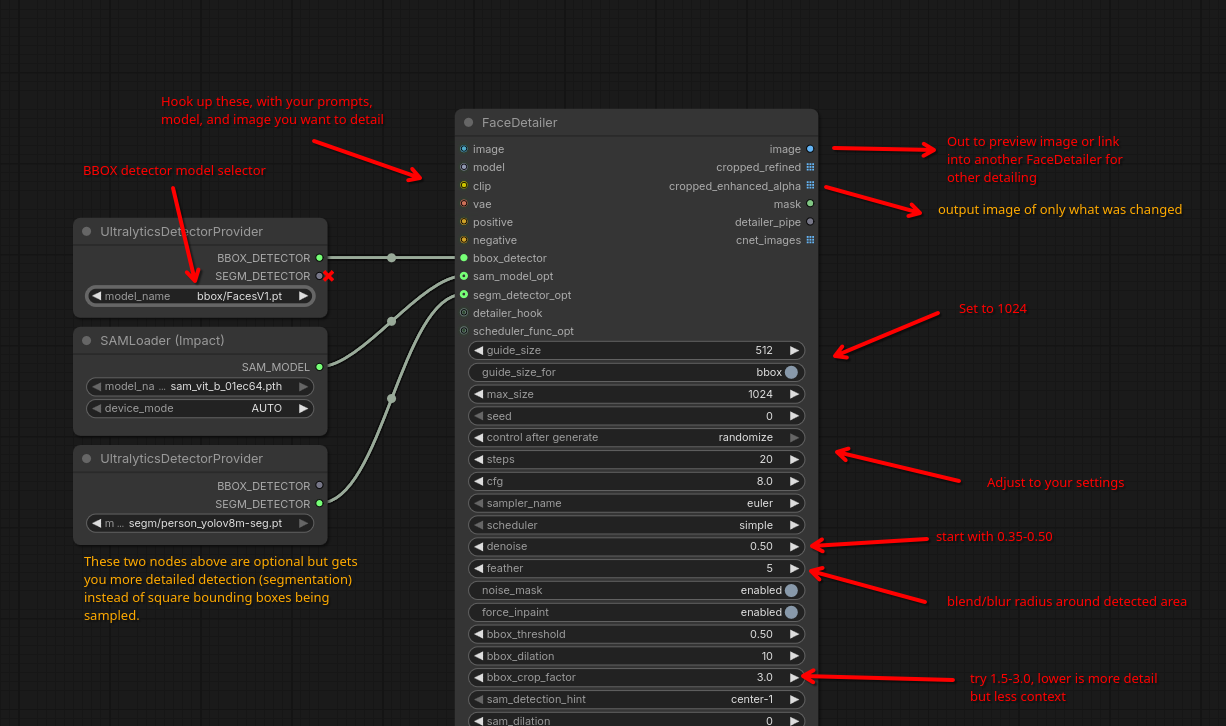 >>9092842install Impact Pack (and subpack) and look into hooking up Facedetailer to your workflowI made an image to try explain how to use it>>9092861 this only works if you have the system resources for it, considering SAM3 uses a 3.5Gb large modela simpler solution especially if you have limited resources is to go to i.e. Civitai and download detection models for specific stuff; search for "Adetailer" and put downloaded .pt files in your /comfyui/models/ultralytics/bbox folder