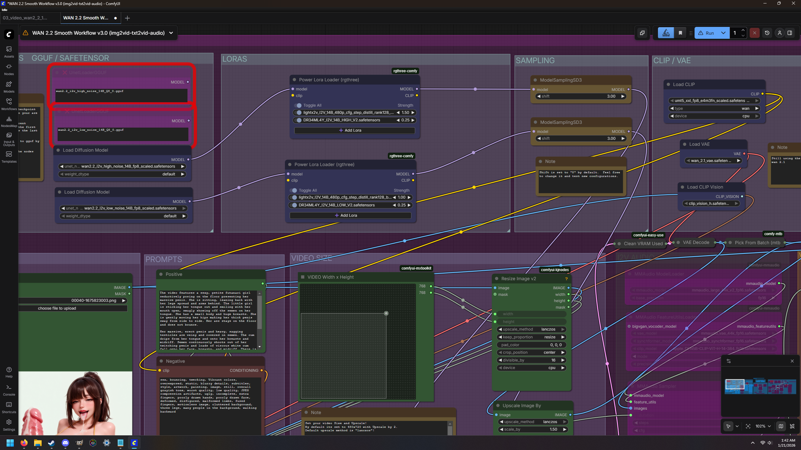>>9091406I'm too smoothbrain to figure out ComfyUI, so I just use https://civitai.com/models/1847730?modelVersionId=2264611 for the 2.2 workflow and then reduce the video filesize with handbrake.I'm sure they could look nicer, but six second videos in about 300 seconds works fine for me.