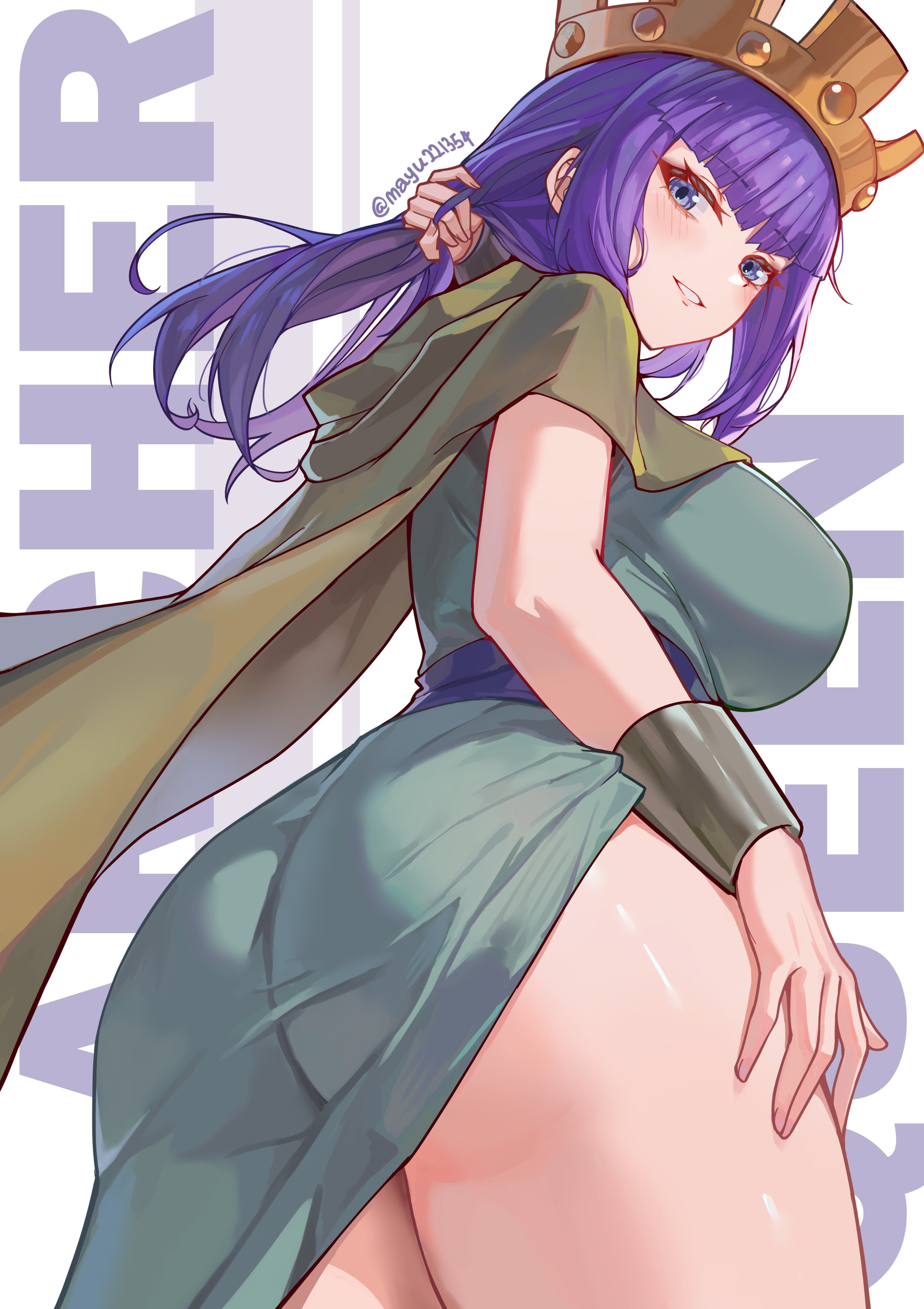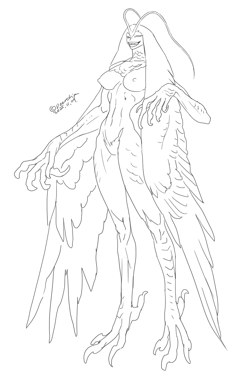 >Her eyes narrowed, the faintest trace of a smile curling her lips. >She stepped forward, shedding the eye-patterned cloak. The woman beneath was both resplendent and unnerving—her skin pale as marble, her long hair streaked with green and crimson. Two twisted horns of hair rose from her head, their tips matching the color of her blazing eyes. >Her beauty was of an unearthly kind—shapely, elegant, yet imbued with something alien, as if nature itself had misstepped in crafting her.>The intricate carvings on her body seemed to shift in the flickering firelight, resembling ancient runes one moment and delicate scars the next.