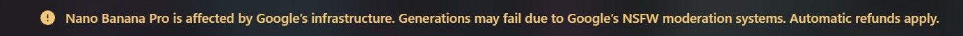 >>9110569NTA ( Im this Anon >>9097637 >>9106181 ) It is definitely returning more failed gens than last week . I can still get stuff through but its with a little more brute force than before. Higgsfield has started showing this message now when using NBP. Higgsfield Ultimate plan is pretty good .. I signed up for a month last week .. for £30 you basically get unlimited NBP 2k ( 4 concurrent image gens ) and a few other unlimited models plus 1200 credits if you want instant / more gens etc, maybes worth a look.