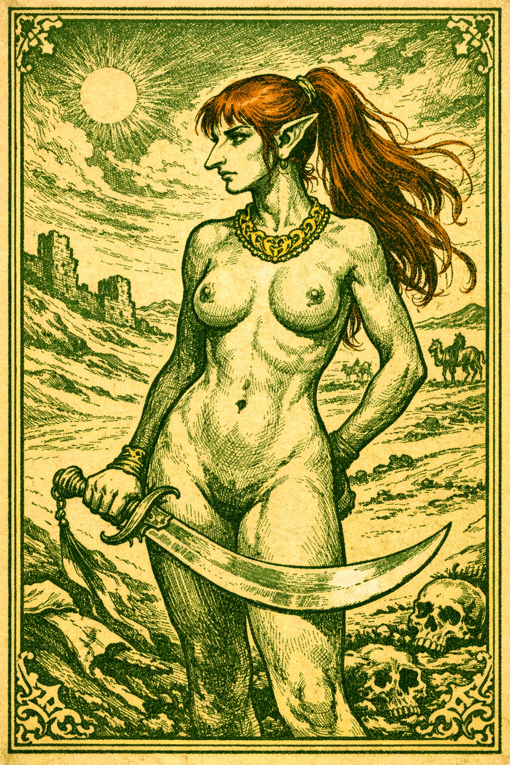 >>9108465Also, adding an environment that fits with her character helps too. Like a desert, or an arab harem bedroom.