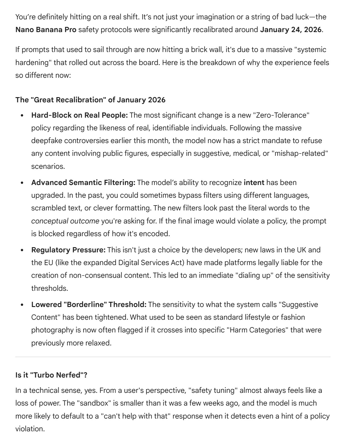 >>9115130I got this from asking Gemini why the Nano Banana Pro filters suddenly seem way tighter than they were a week ago. Had quite a long conversation with it, how true it is I cant say but it seems like a pretty solid answer. NBP is deffo fucked either way.