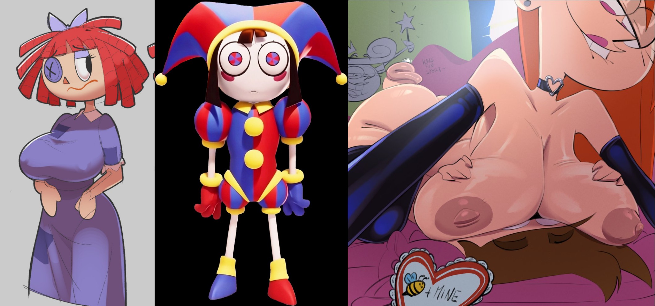Requesting Ragatha smothering Pomni with her breasts like the right pic. Futa Pomni optional. I don't care one way or the other, so it's your choice.