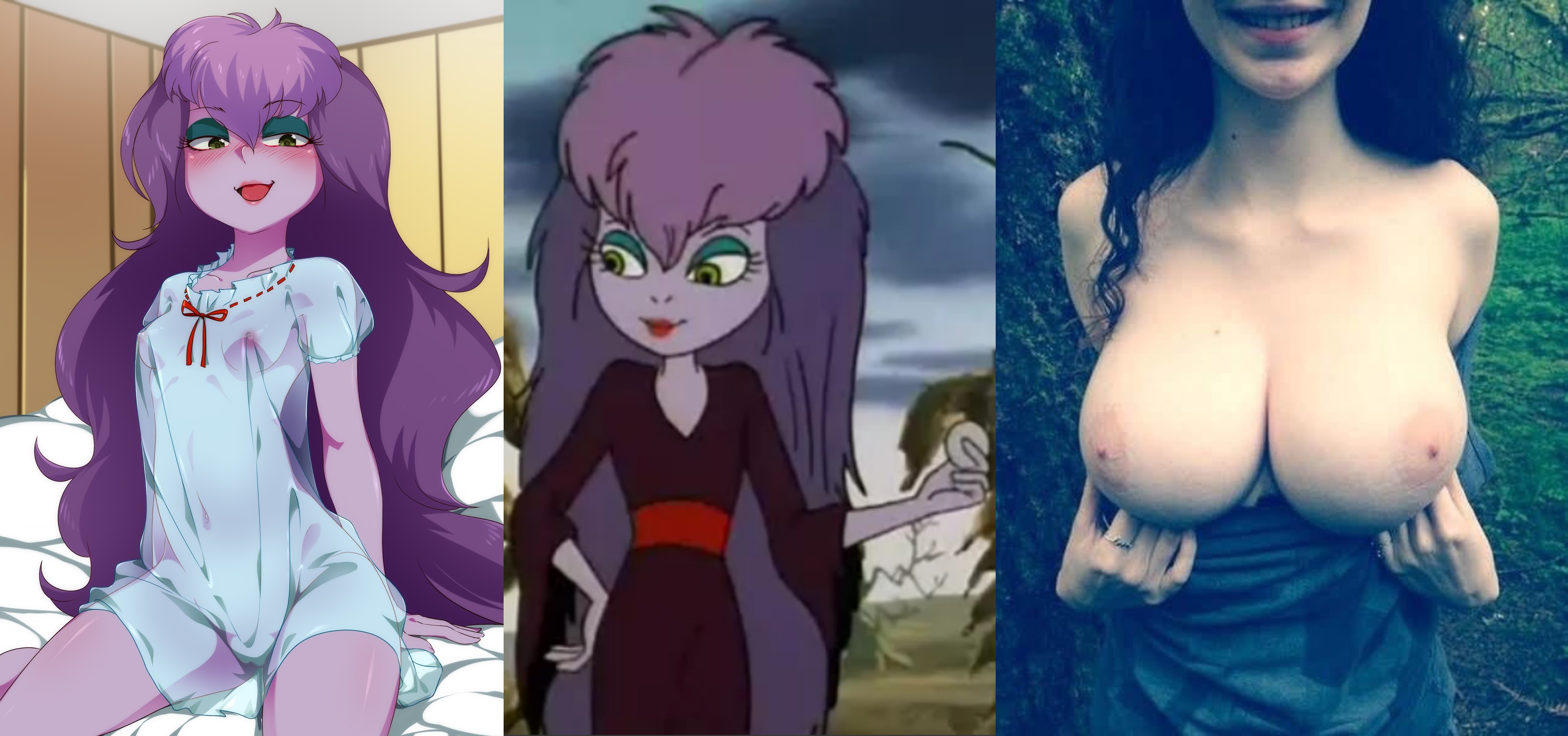 Requesting the pin up on the right with sexy Madam Mim. Have her pubes showing from behind the blanket
