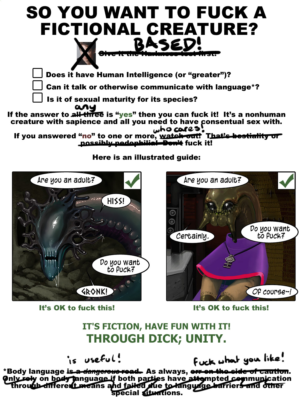 >>9107986nevermind, i have in fact found the rule lmao. i was too concentrated on the ones listed in the OP and not the boardwide ones.(also pretty sure birrin are intelligent so ignore the fact that it is saying "gronk.")unless the xeno in question is from a franchise (eg mass effect) how can you even determine intelligence? is it just a guessing game?