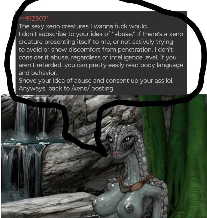 >>9124381Welcome to /xeno/, we have:>Casual admission to zoophilia