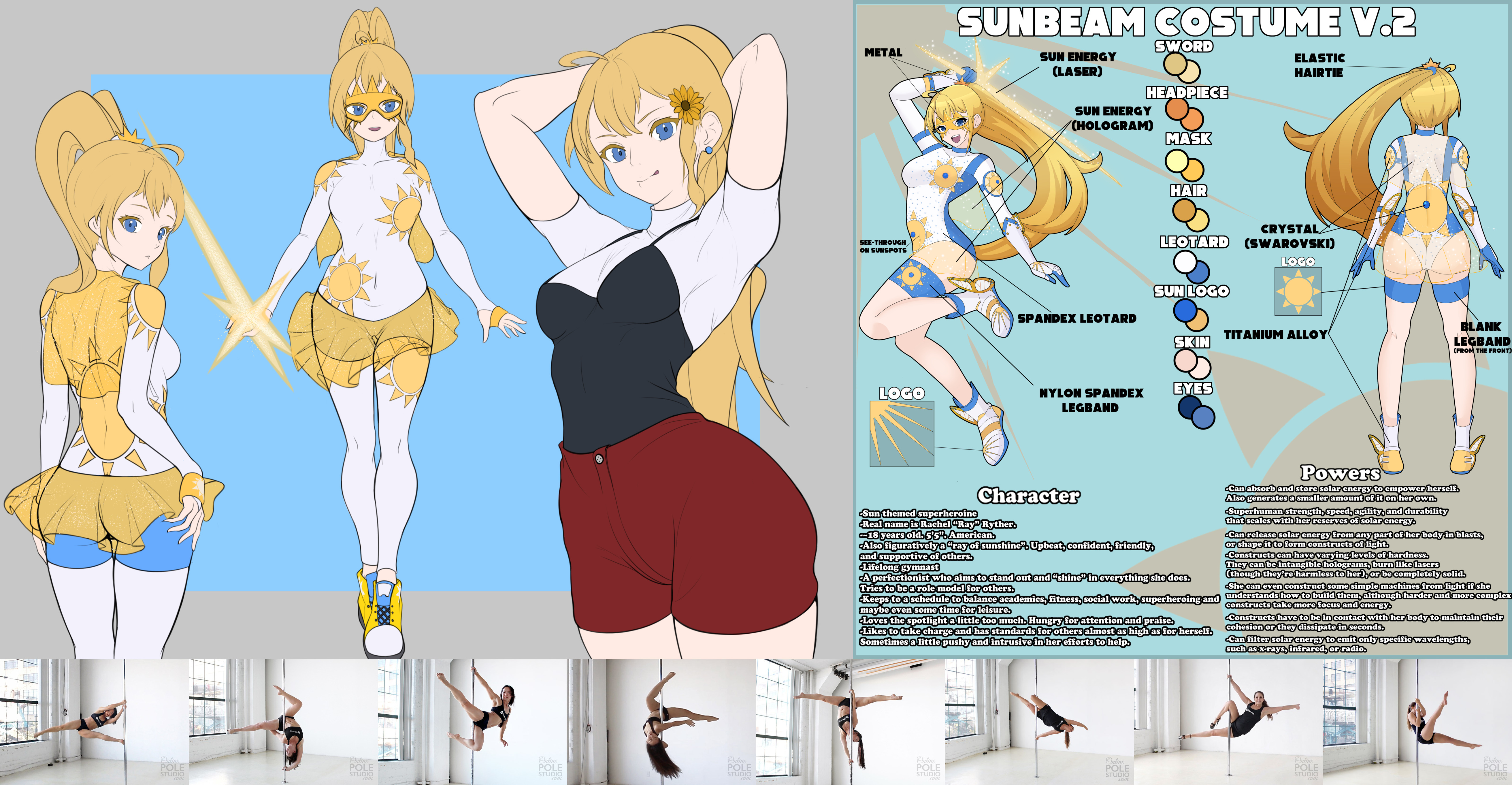 Requesting my superheroine character Sunbeam pole dancing using a pole constructed from light with her powers. You can just draw her doing it normally or you can put an action twist on it by having her kicking some bad guys as she swings around.