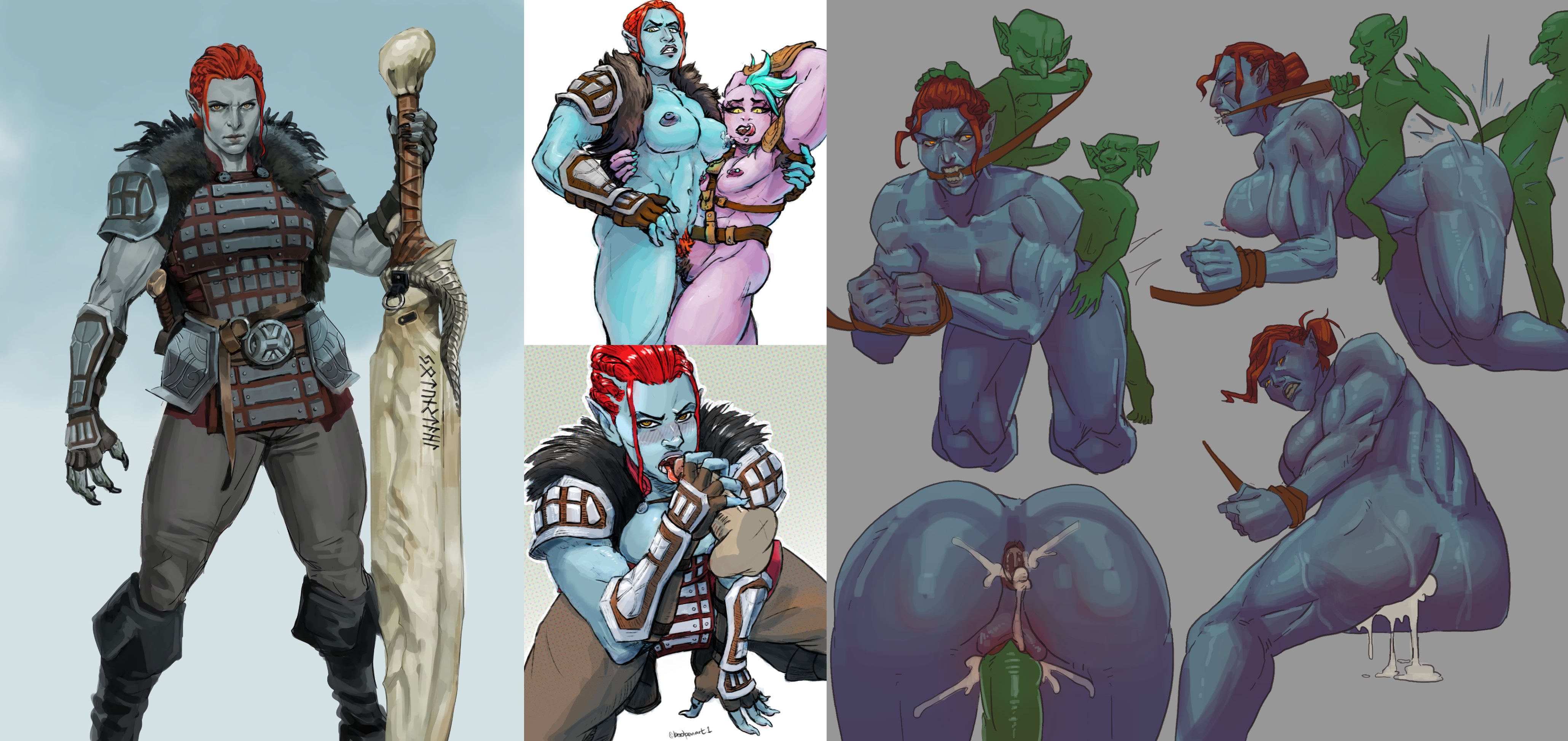 Requesting big buff trollkin Thane in chains as her goblin captors roughly facefuck and jerk off to her