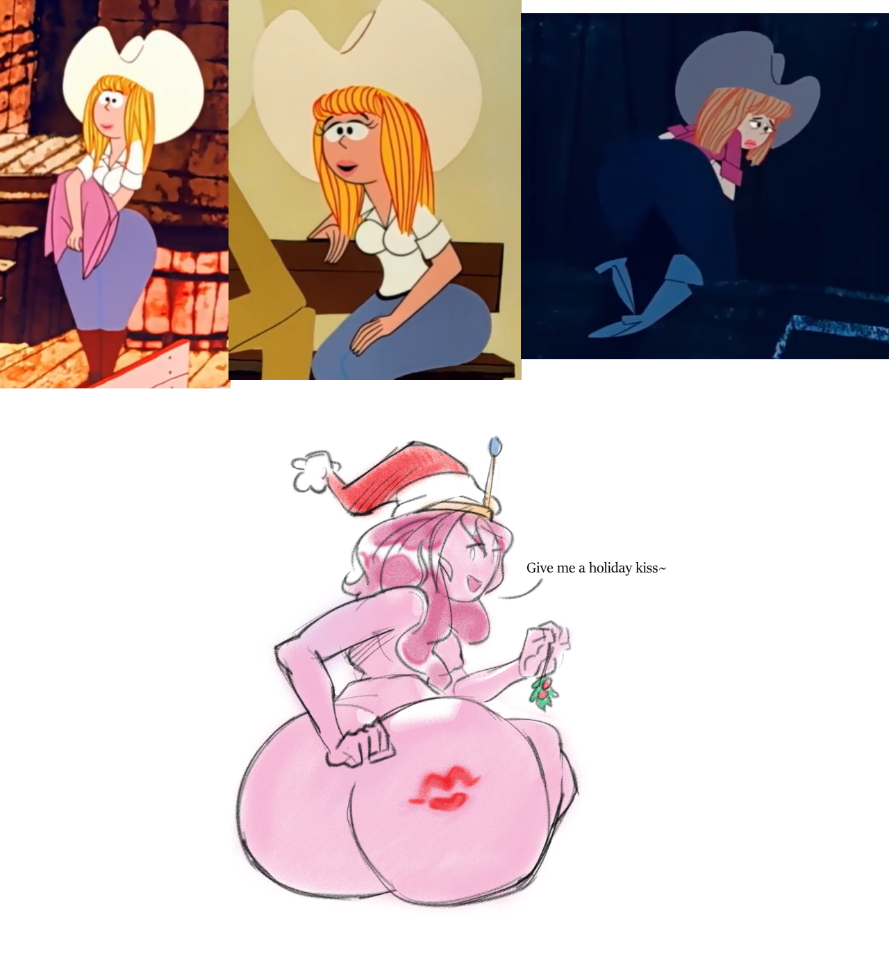 Requesting please draw a two-panel comic based on the concept from the middle and right pictures. In the first panel, redraw the middle picture, but replace Fionna with Aunt Lolly. The second panel should show a point-of-view shot of Princess Bubblegum looking at Aunt Lolly's rear view.