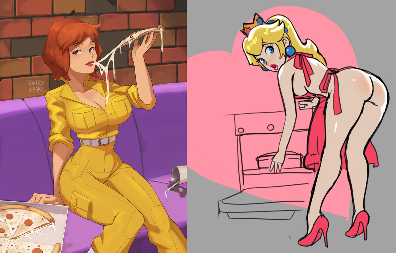 Requesting April O'Neil making and putting pizza in the oven while wearing nothing but apron