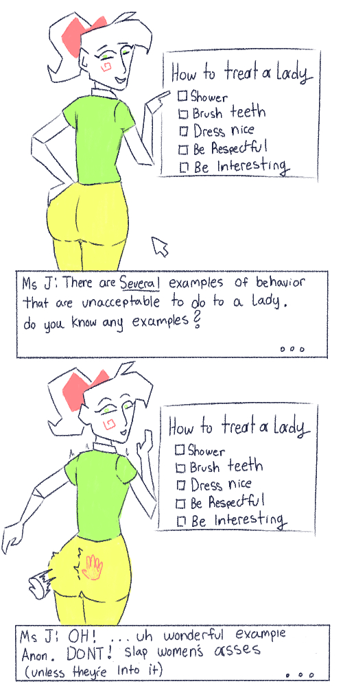 Requesting Ms Butterbean from the Grim Adventures of Billy and Mandy bending over and picking up a piece of chalk, accidentally showing her asshole/pussy while wearing a pair of panties like Peach.
