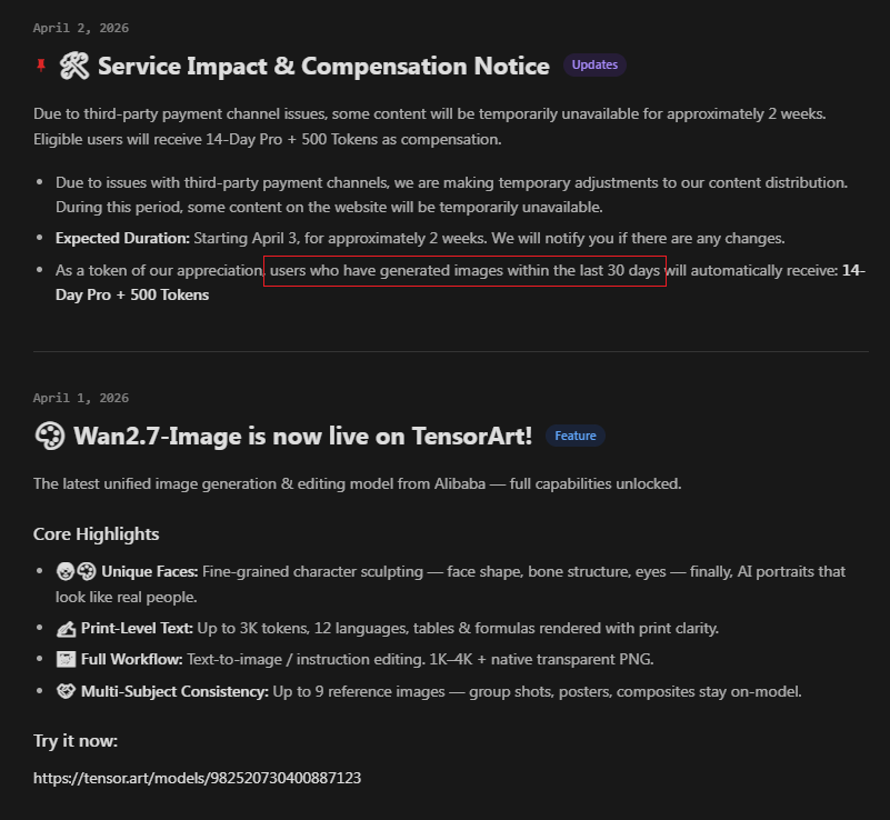 >check tensorart/hub because I need to inpaint something>have 14-day pro membership as compensation for somethingHighly recommend you check your accounts to see if your account was lucky enough to get pro.
