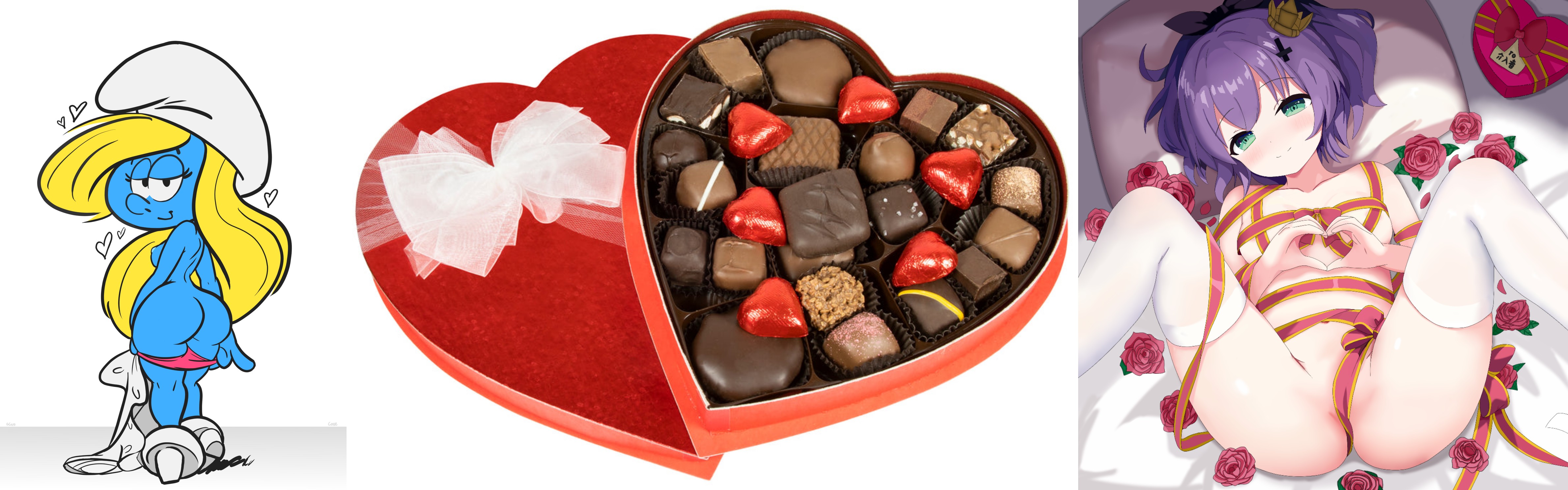 Requesting Smurfette lying naked, wrapped in ribbon, inside of a box of chocolates making heart hands.