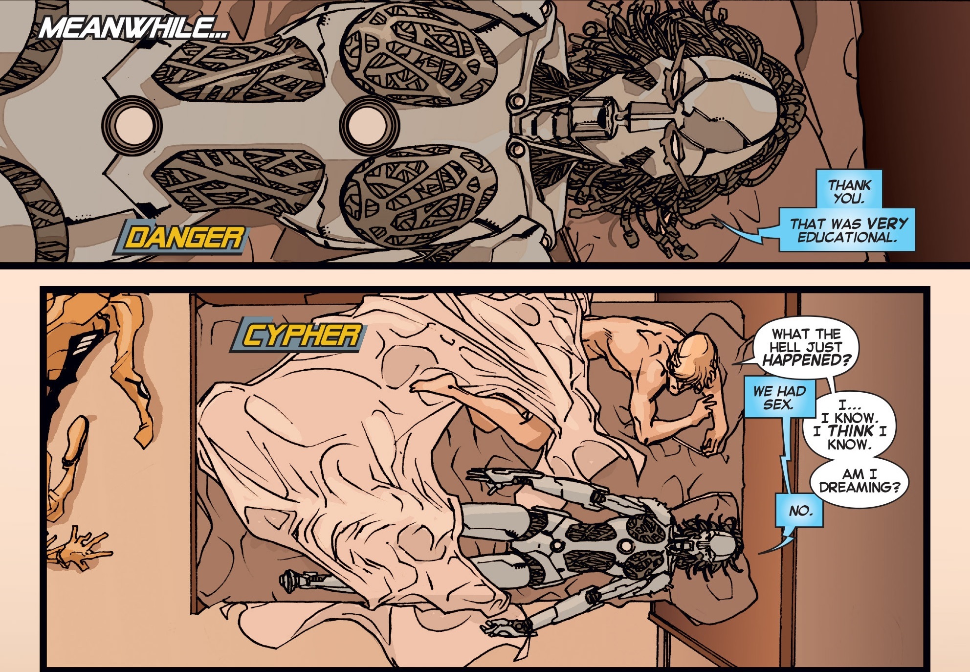 >>9129070It's from Peter David's All New X-Factor run.Also, Danger can morph her body at will, so I imagine she made the proper adjustments for Doug.
