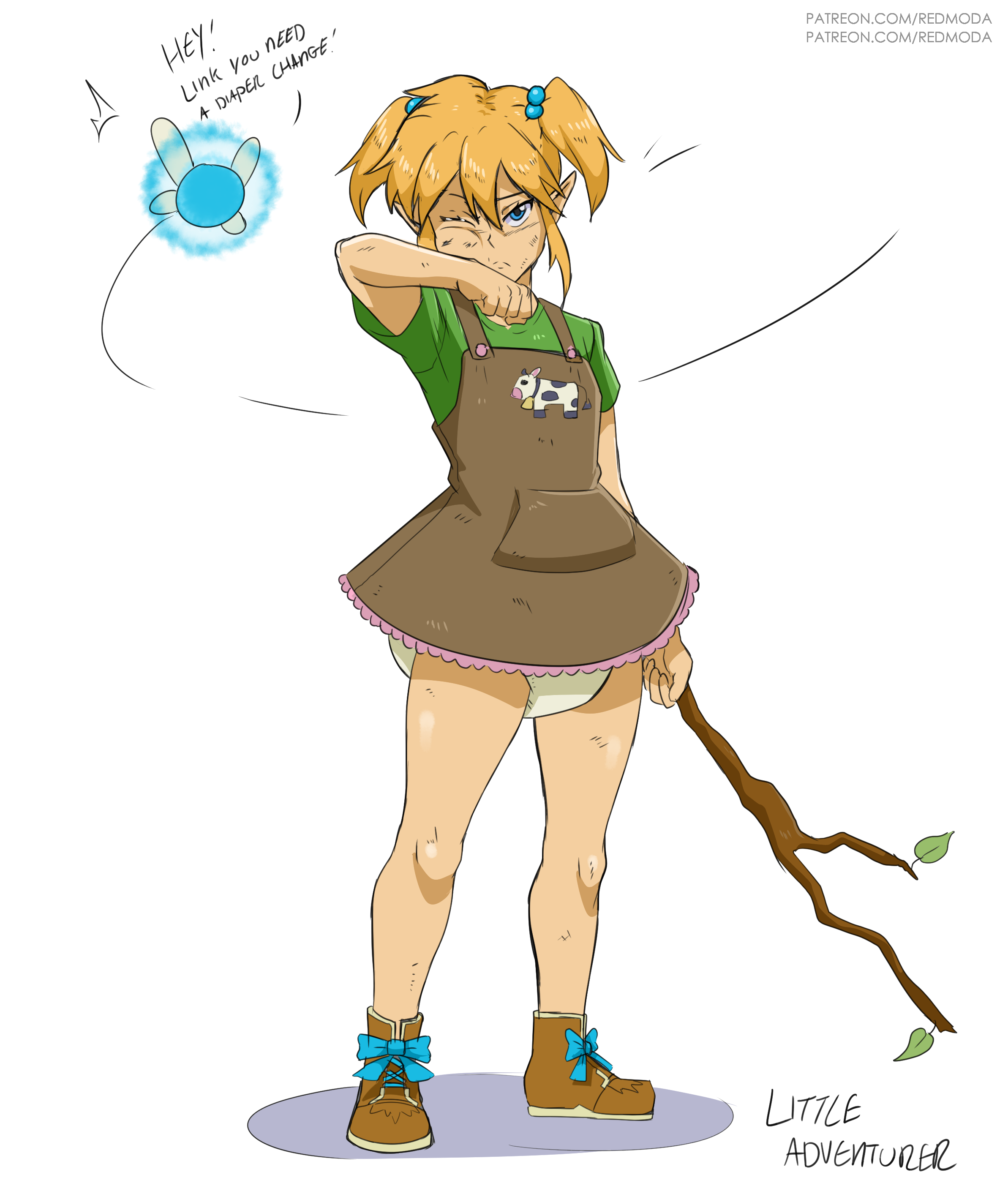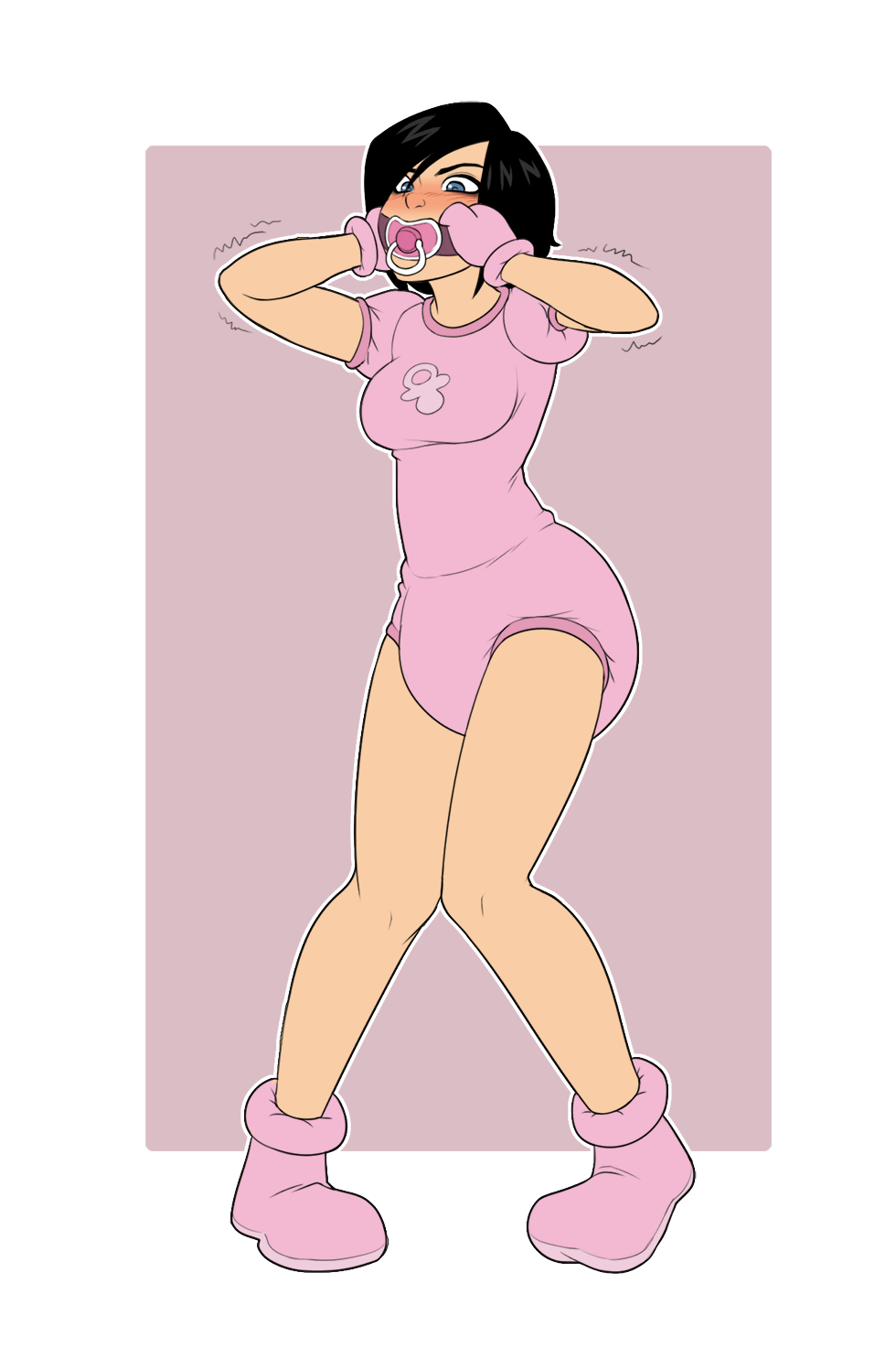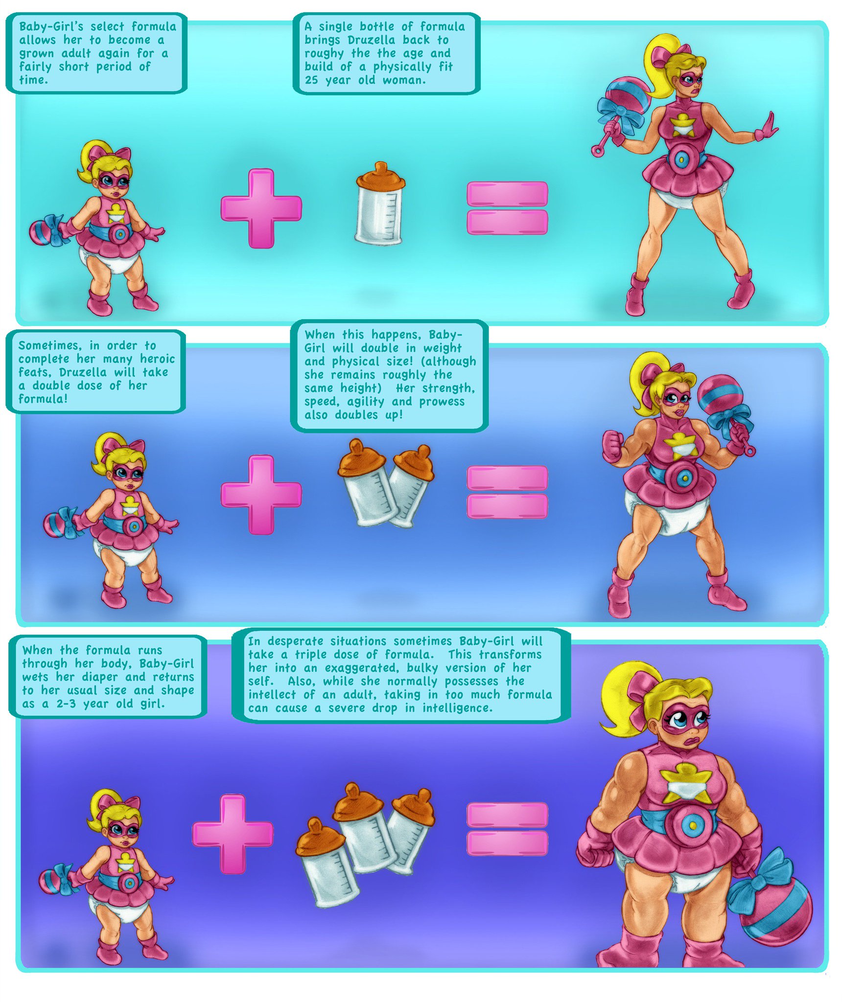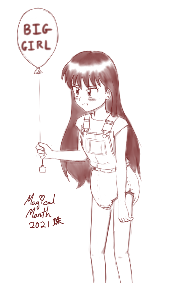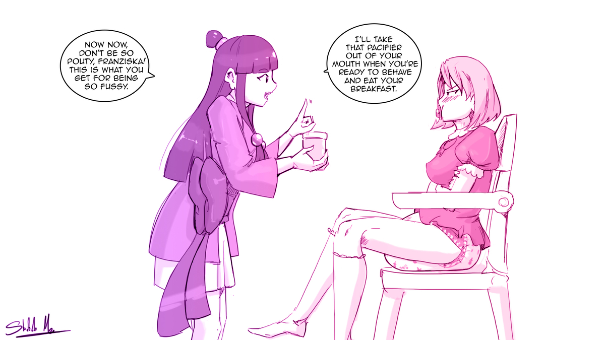 A trope I would like to see more is before and after pics. Maybe the subject is a powerful warrior or just a regular person in casual clothes, but otherwise have at least some semblance of dignity. But they're now in a baby getup looking like an overgrown toddler. Regardless whether the subject is willing or reluctant, or they're being baby-brained or pouty over it, there's some spiciness to it either way. Personally I think it would be more powerful if the simpler the after outfit is, especially in comparison with the previous outfit, like just a onesie or T-shirt with socks, instead of an elaborate baby dress.